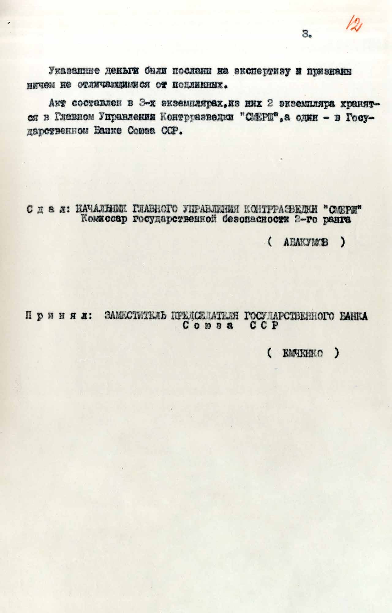 31 марта 1945 года докладной запиской № 695/А начальник ГУКР «Смерш» НКО СССР комиссар 2-го ранга В.С. Абакумов доложил в Госкомитет Обороны СССР И.В. Сталину о денежных средствах, изъятых военными контрразведчиками у германских агентов и переданных в Госбанк Союза СССР.