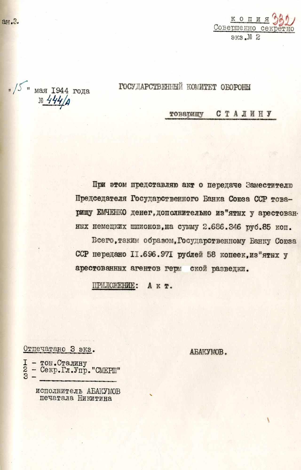 Докладная записка № 444/А начальника ГУКР «Смерш» НКО СССР комиссара ГБ 2-го ранга В.С. Абакумова в ГКО СССР И.В. Сталину о деньгах, изъятых у агентов германской военной разведки в годы Великой Отечественной войны и переданных в Госбанк СССР. 15 мая 1944 г. Москва