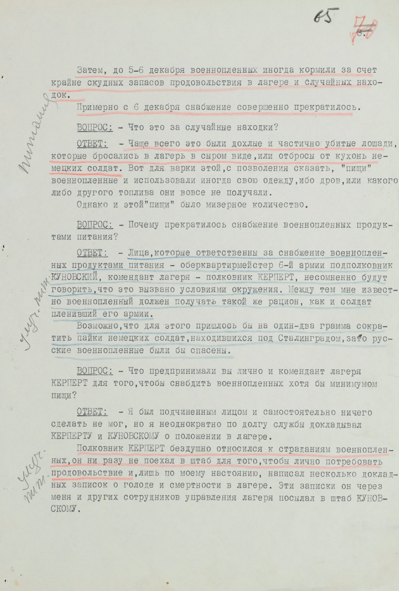 ... После 5 декабря снабжение военнопленных продуктами питания прекратилось совершенно. Лишь изредка удавалось случайно достать дохлую лошадь, которую варили для военнопленных. Таким образом с 5 декабря 1942 года среди военнопленных начался настоящий голод, на почве чего среди них наступила большая смертность: с 10 декабря ежедневно умирало около 50 человек".