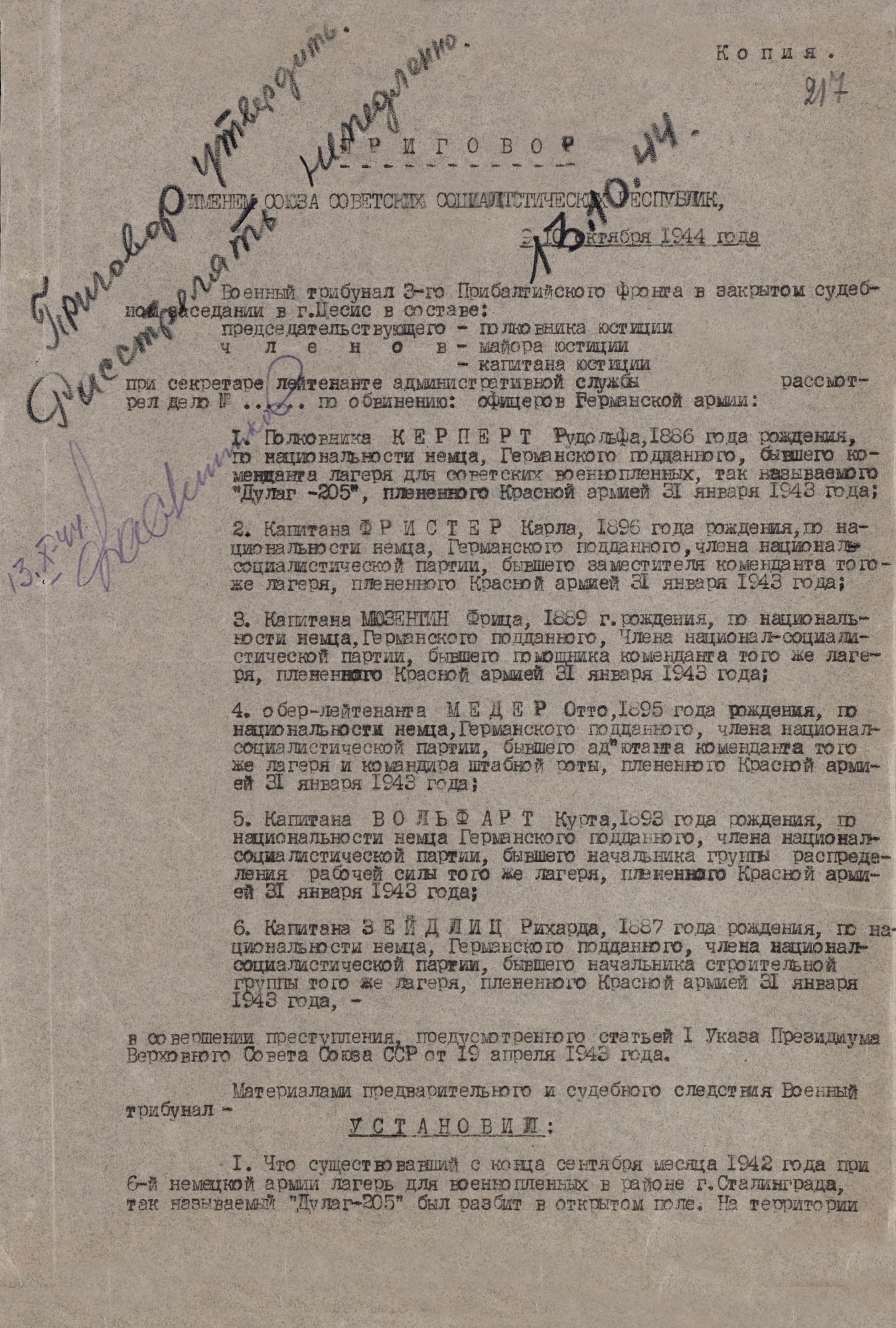 На основании Указа Президиума Верховного Совета СССР от 19 апреля 1943 года № 39 приговор Военного трибунала 3-го Прибалтийского фронта в отношении администрации лагеря «Дулаг-205» был приведен в исполнение 13 октября 1944 года.