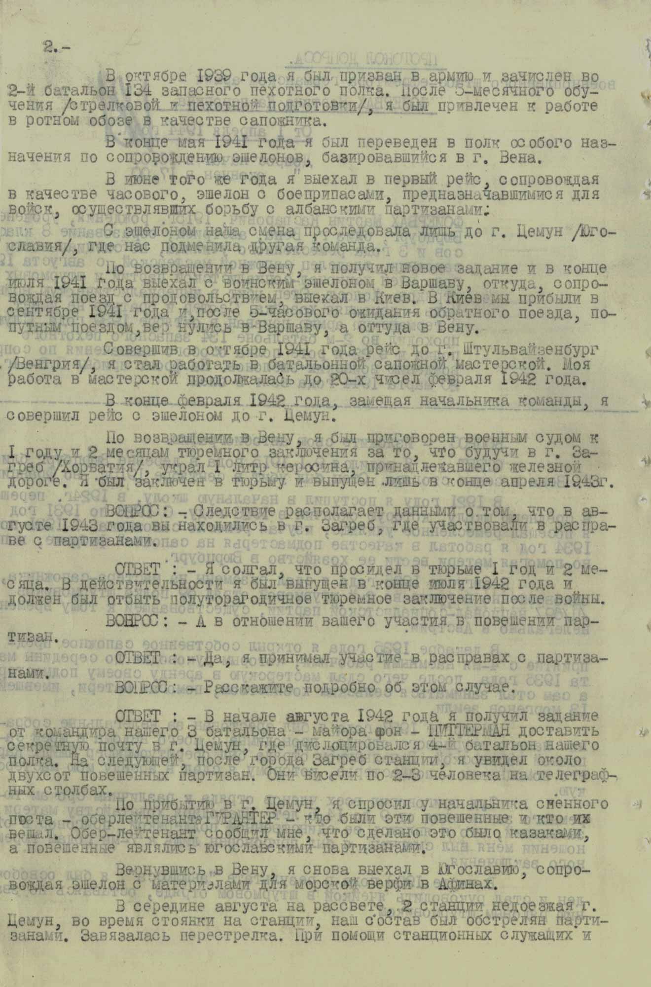Во время первичного допроса в Разведотделе штаба Отдельной Приморской армии (ОПАРМ) он попытался выдать себя за «члена австрийской Компартии, репрессированного германскими властями».
