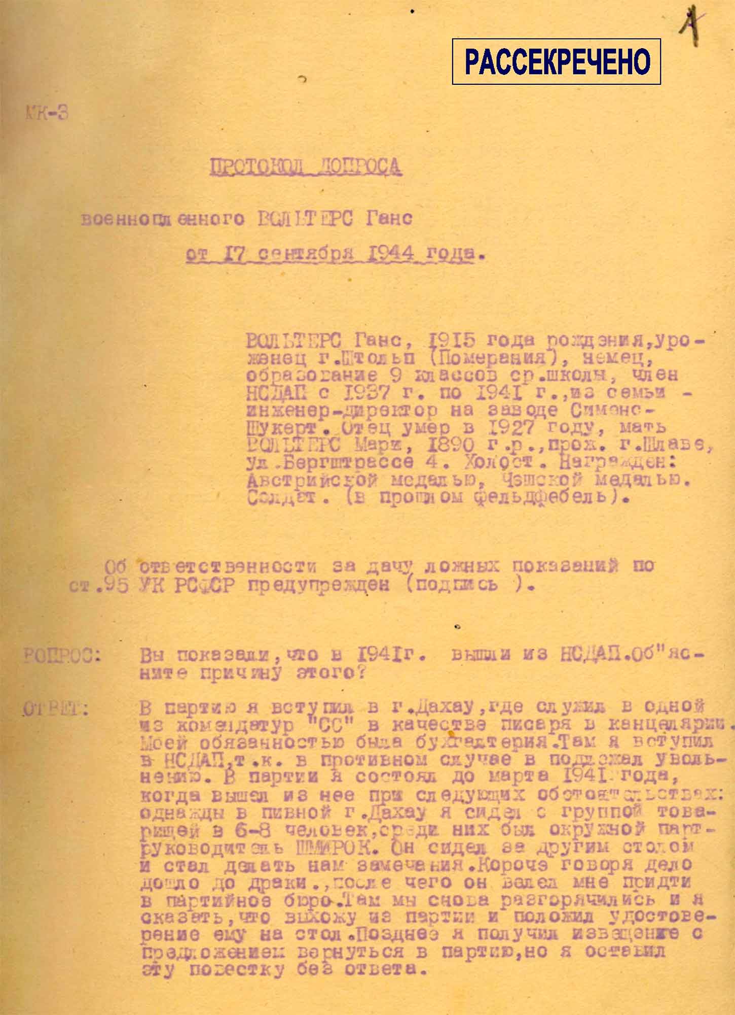 № 2. Протокол допроса рядового германской армии Г. Вольтерса. 17 сентября 1944 г. Действующая армия.