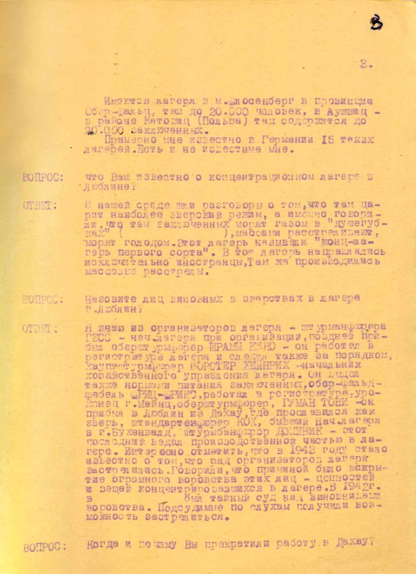 В ходе допроса 17 сентября 1944 года Вольтерс дал показания о концлагерях Германии, в том числе и о Люблинском «лагере смерти»: