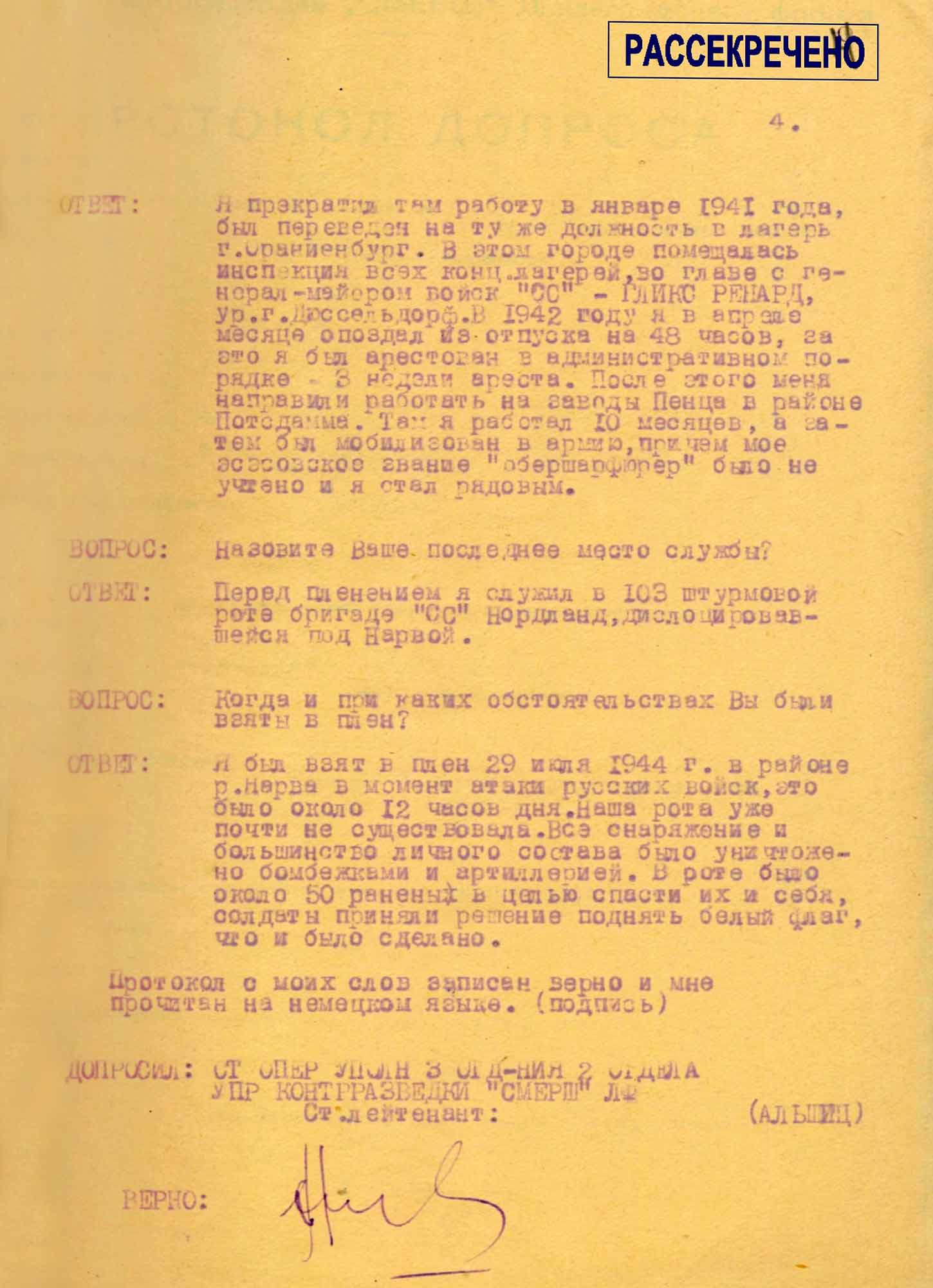 В конце июля 1944 года в ходе боевых действий под Нарвой был захвачен рядовой 103-й штрафной роты 23-го панцергренадерского полка «Норге» 11-й дивизии СС «Нордланд» Ганс Вольтерс. Следствие в его отношении вели сотрудники УКР «Смерш» Ленинградского фронта. В ходе допросов выяснилось, что с 1937 года по 1941 год он проходил службу в комендатуре концлагеря в г. Дахау.