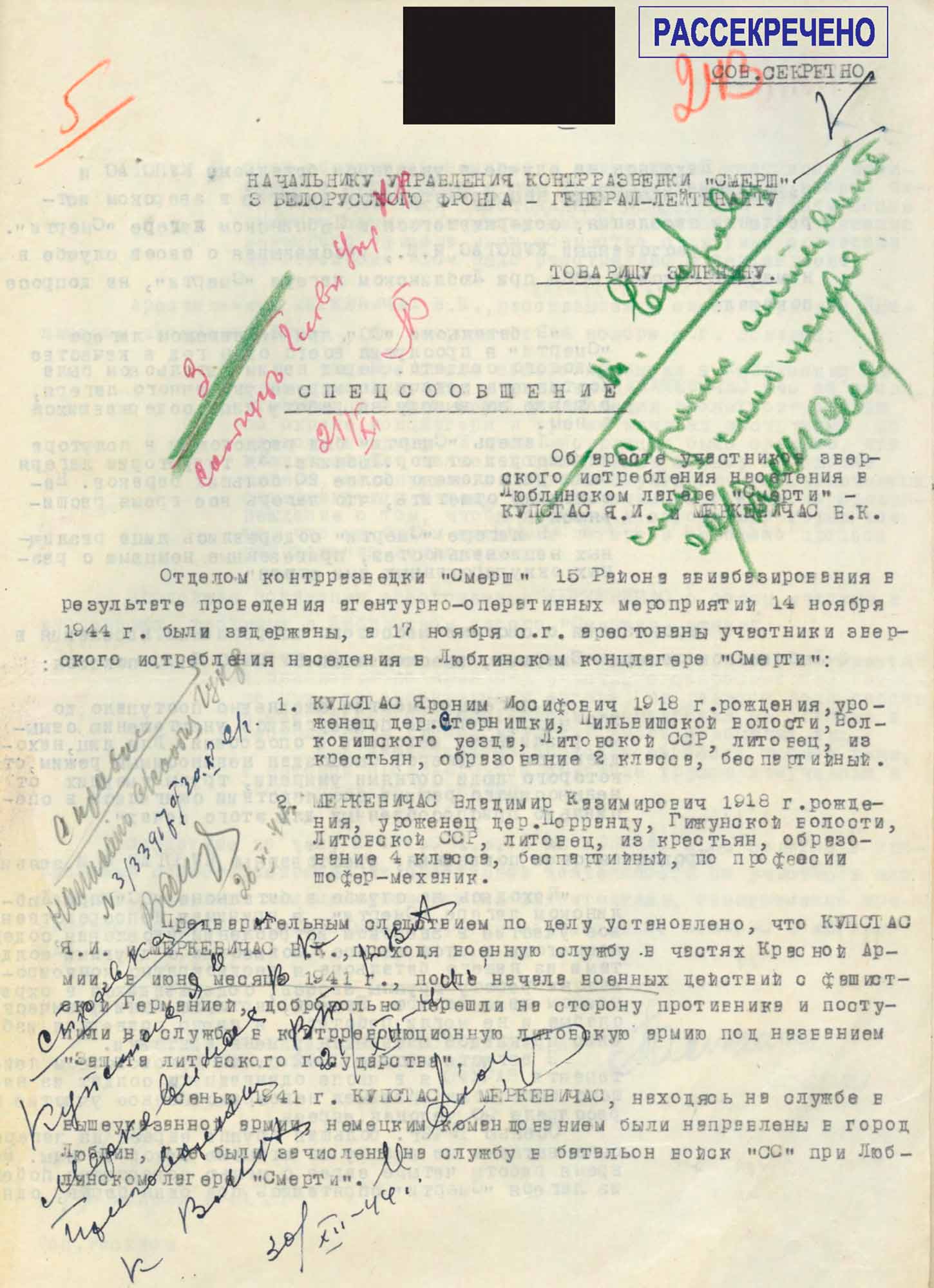 № 1. Спецсообщение ОКР «Смерш» 16-го района авиабазирования начальнику УКР «Смерш» 3-го Белорусского фронта генерал-лейтенанту П. Зеленину «Об аресте участников зверского истребления населения в Люблинском лагере „Смерти“ Купотас Я.И. и Меркевичас В.К.». Не ранее ноября 1944 г. Действующая армия.
