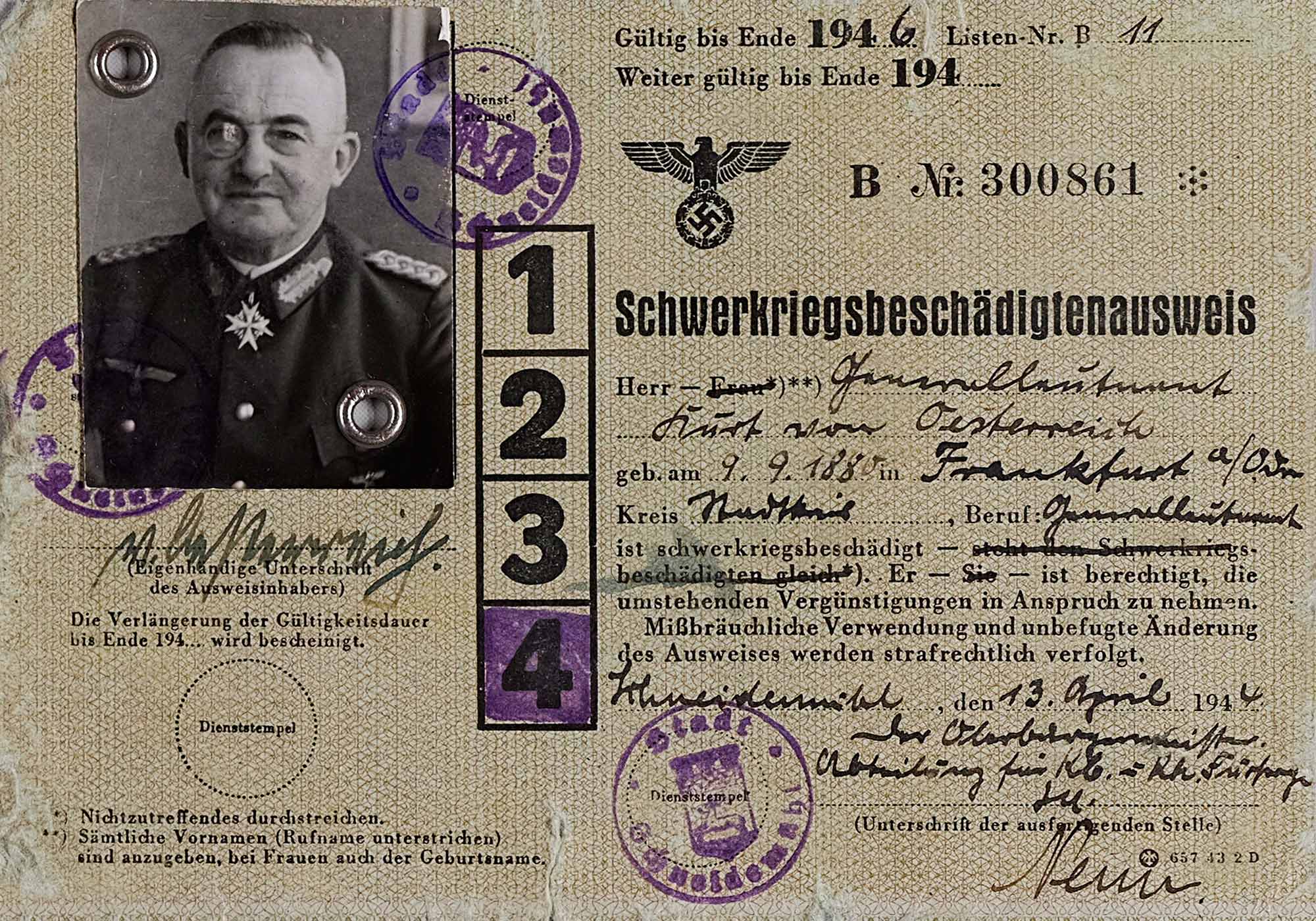 № 4. Удостоверение инвалида (свидетельство о ранении в ходе боевых действий) генерал-лейтенанта К. фон Остеррайха. 13 апреля 1944 г.