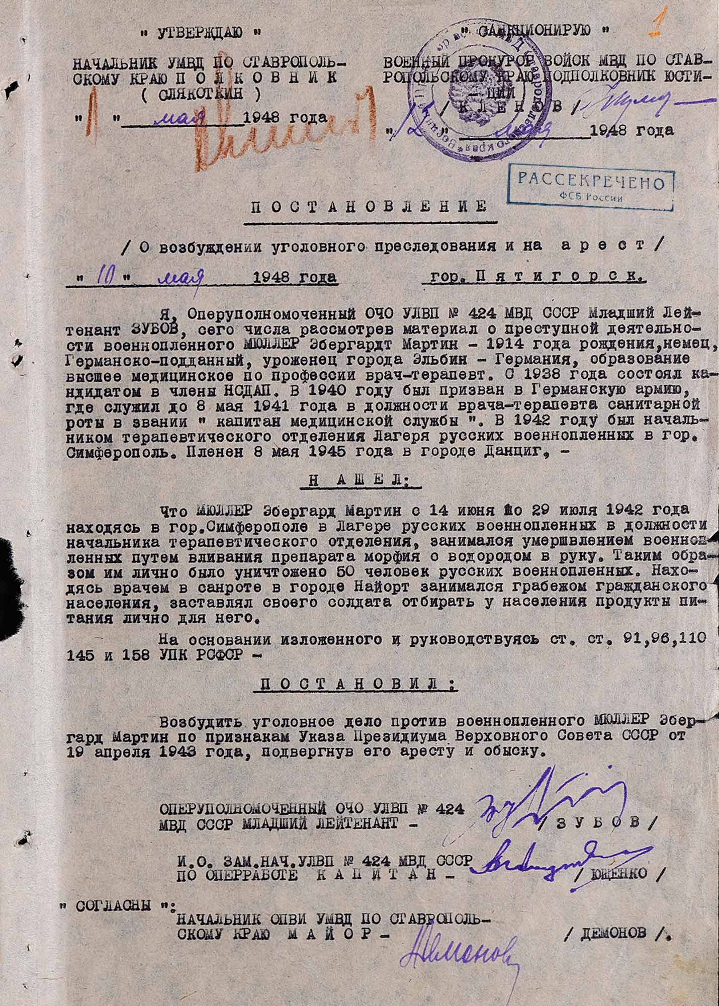 Постановление о возбуждении уголовного преследования и на арест капитана медицинской службы Э. Мюллера. 10 мая 1948 г. Пятигорск.