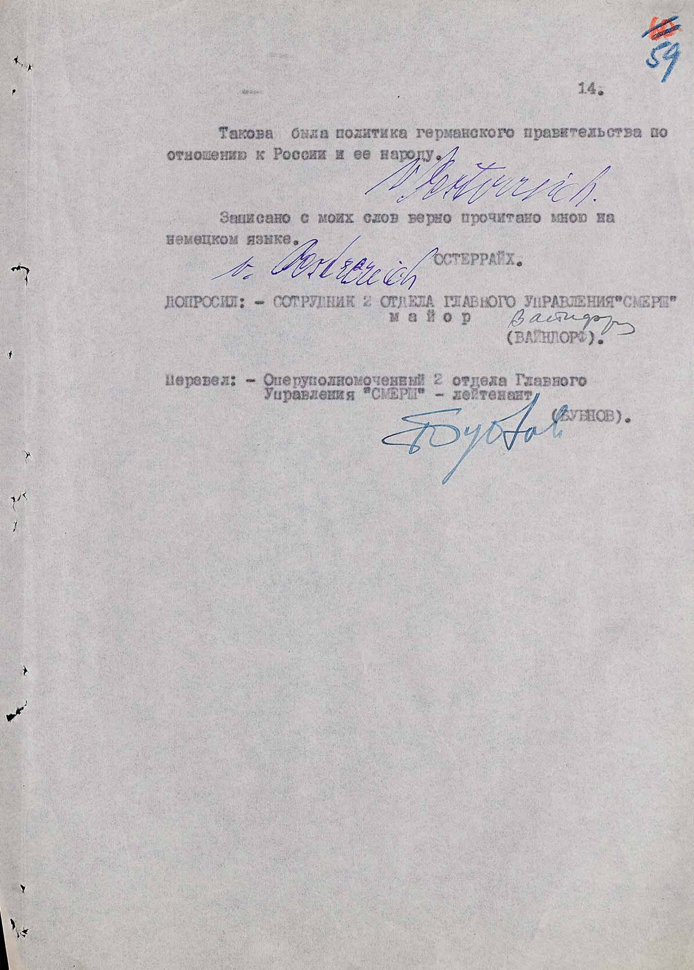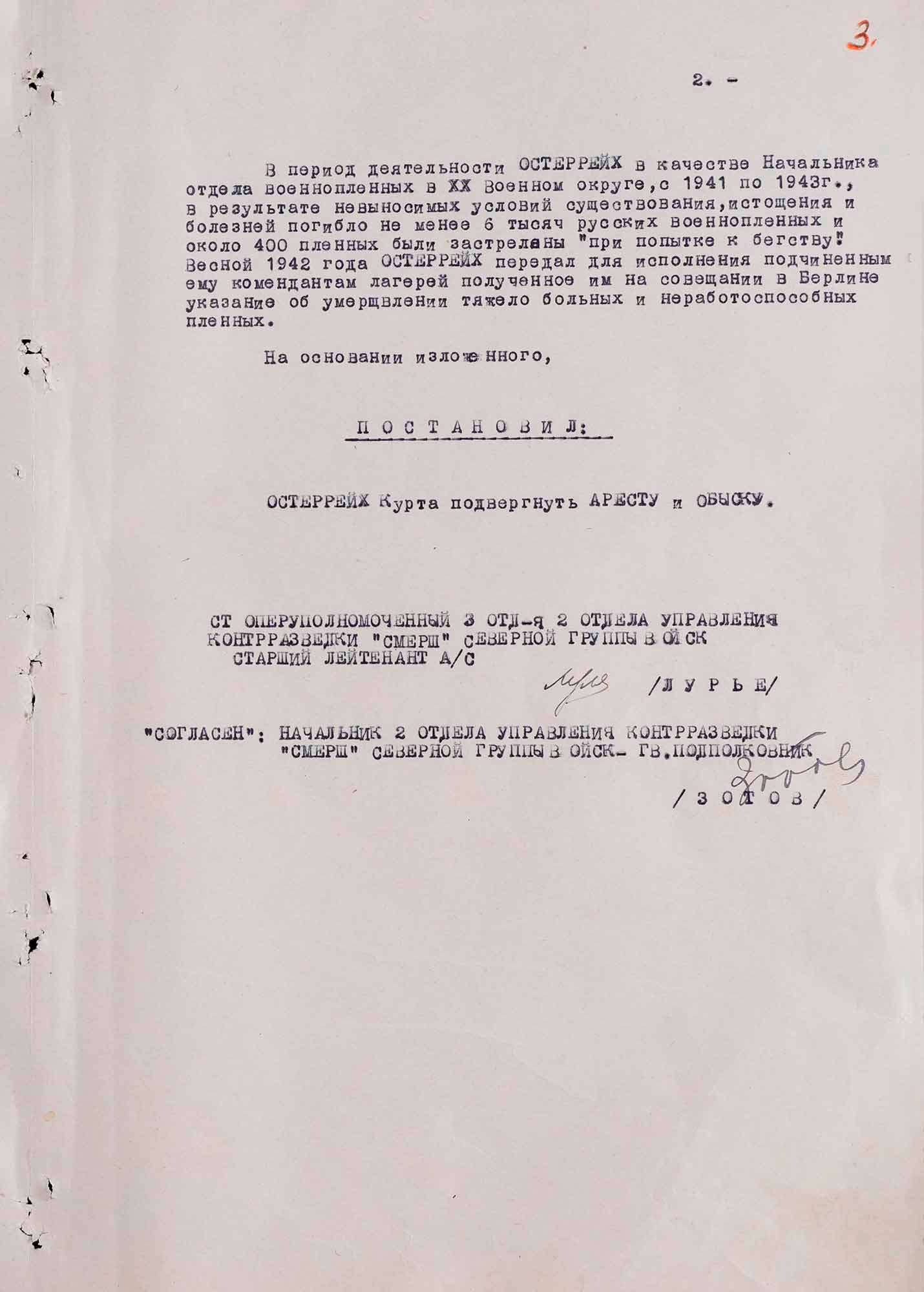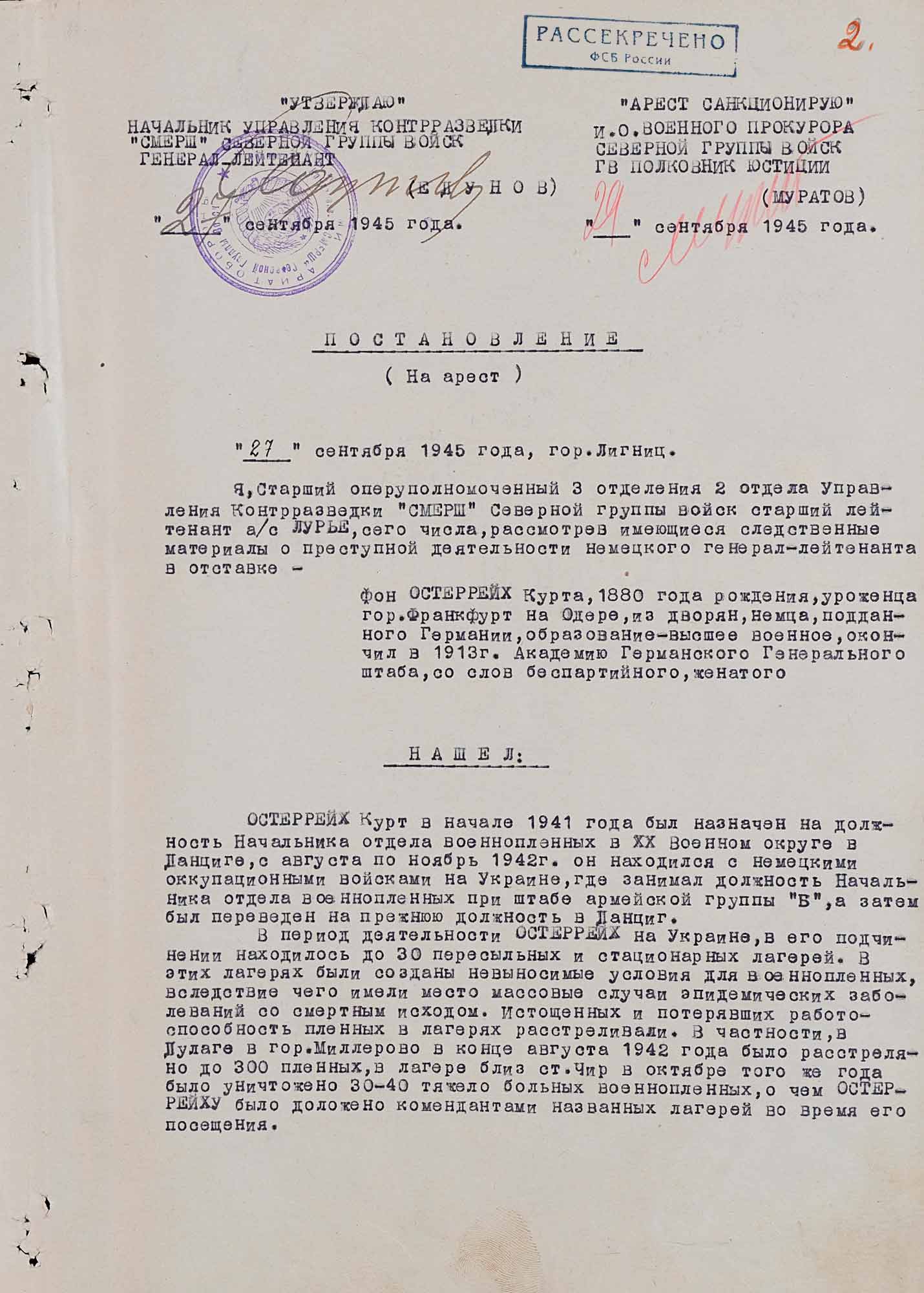 Так, 27 сентября 1945 года начальник Управления контрразведки «Смерш» Северной группы войск генерал-лейтенант Едунов Я.А. подписал постановление на арест генерал-лейтенанта германской армии в отставке Курта фон Остеррайха.