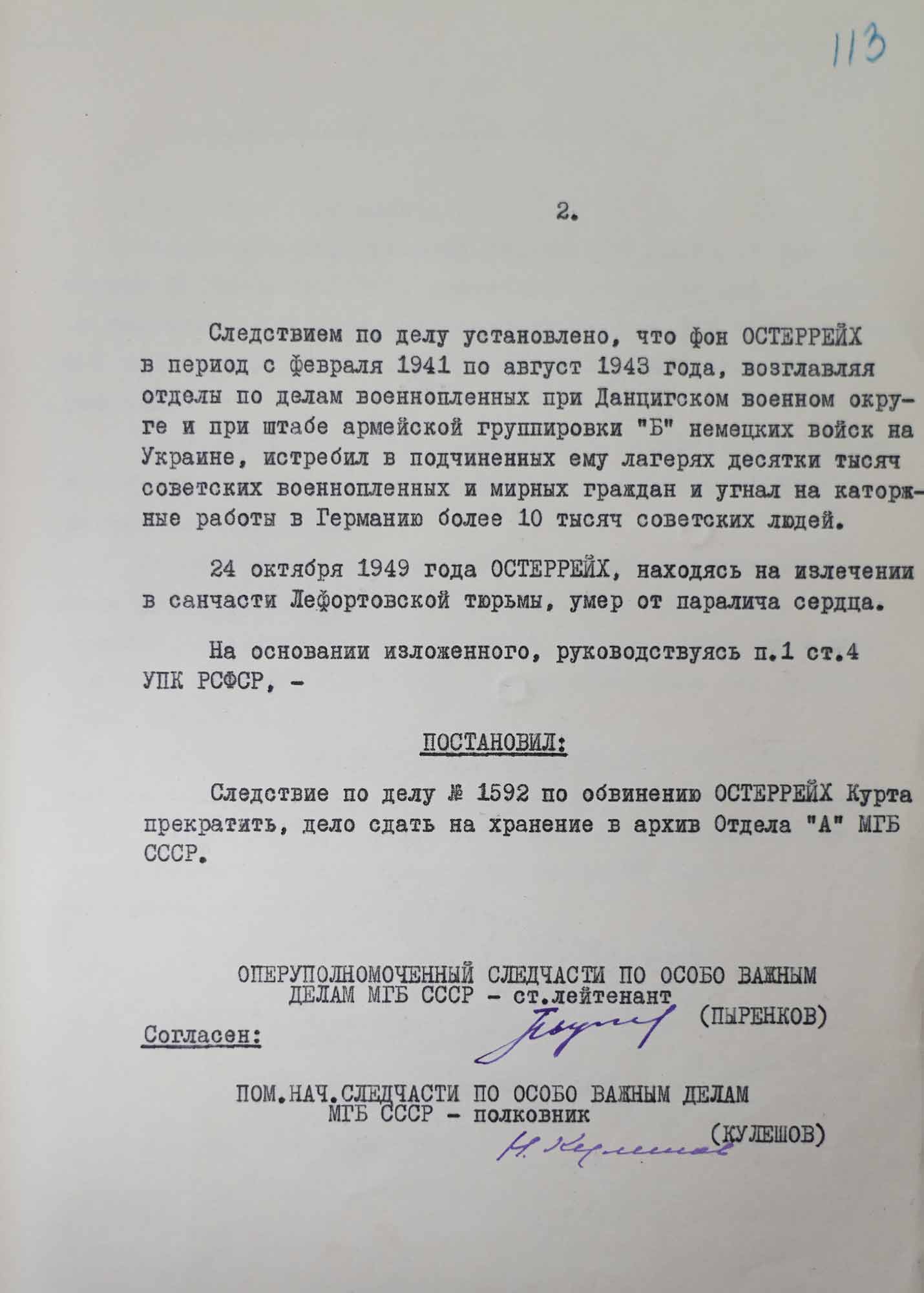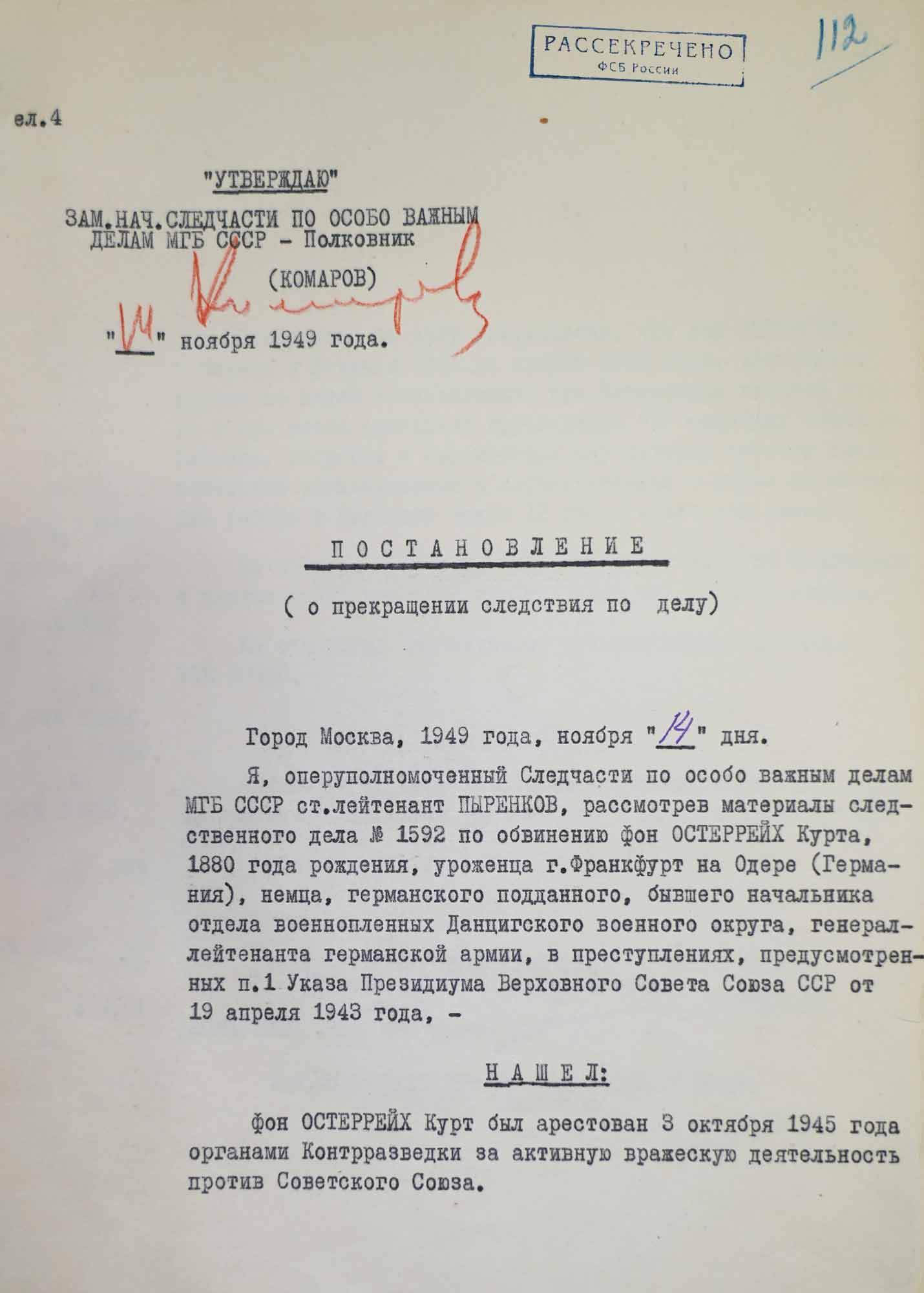Постановление о прекращении следствия по делу К. фон Остеррайха в связи со смертью последнего в санчасти Лефортовской тюрьмы. 14 ноября 1949 г. Москва.