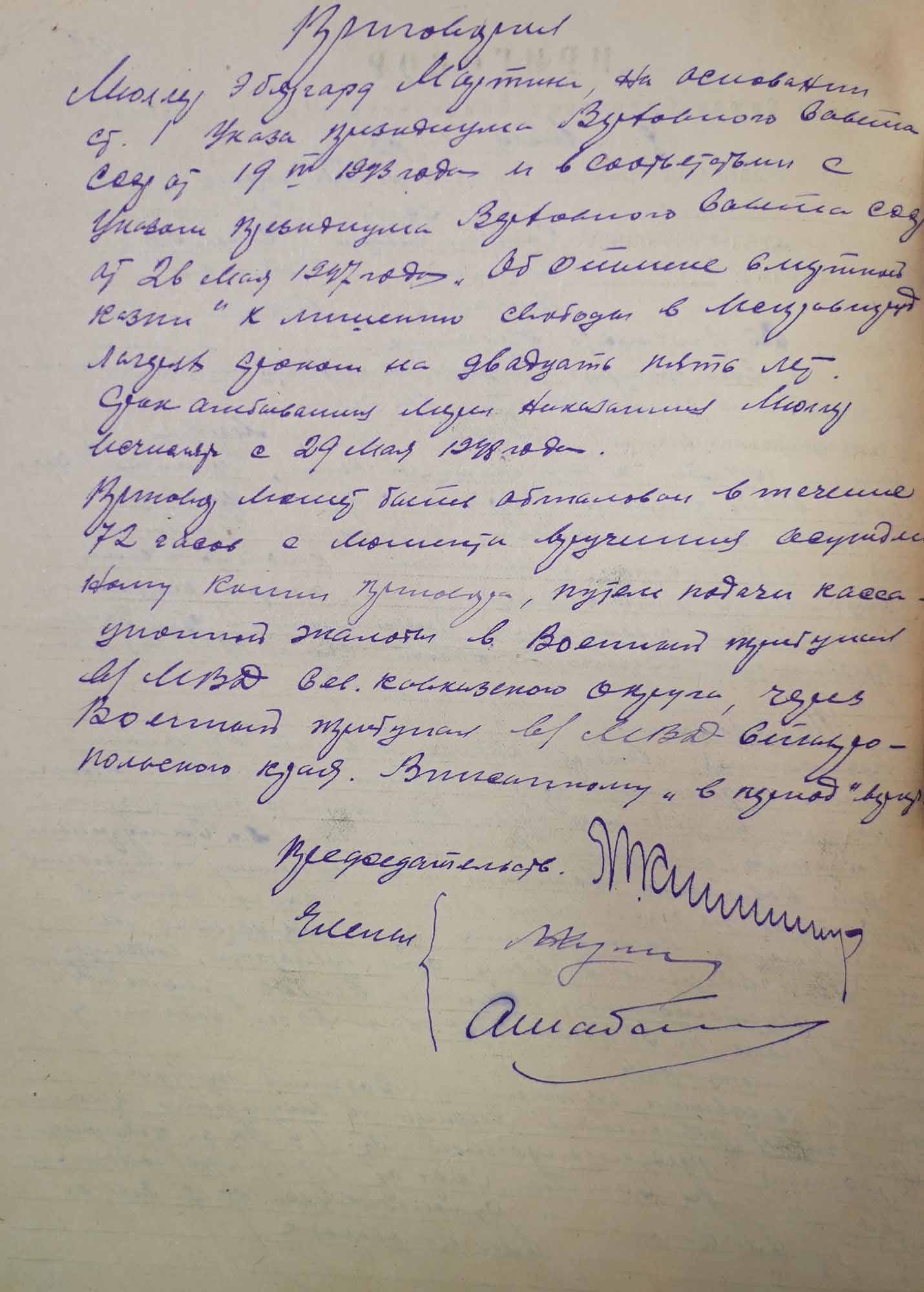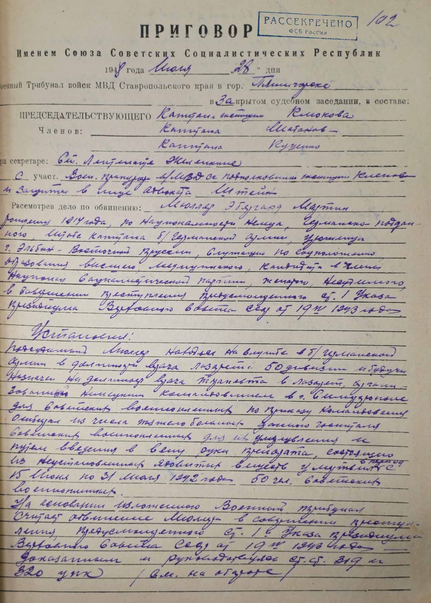 Приговор военного трибунала войск МВД Ставропольского края по делу капитана медицинской службы Э. Мюллера. 28 июля 1948 г. Пятигорск.