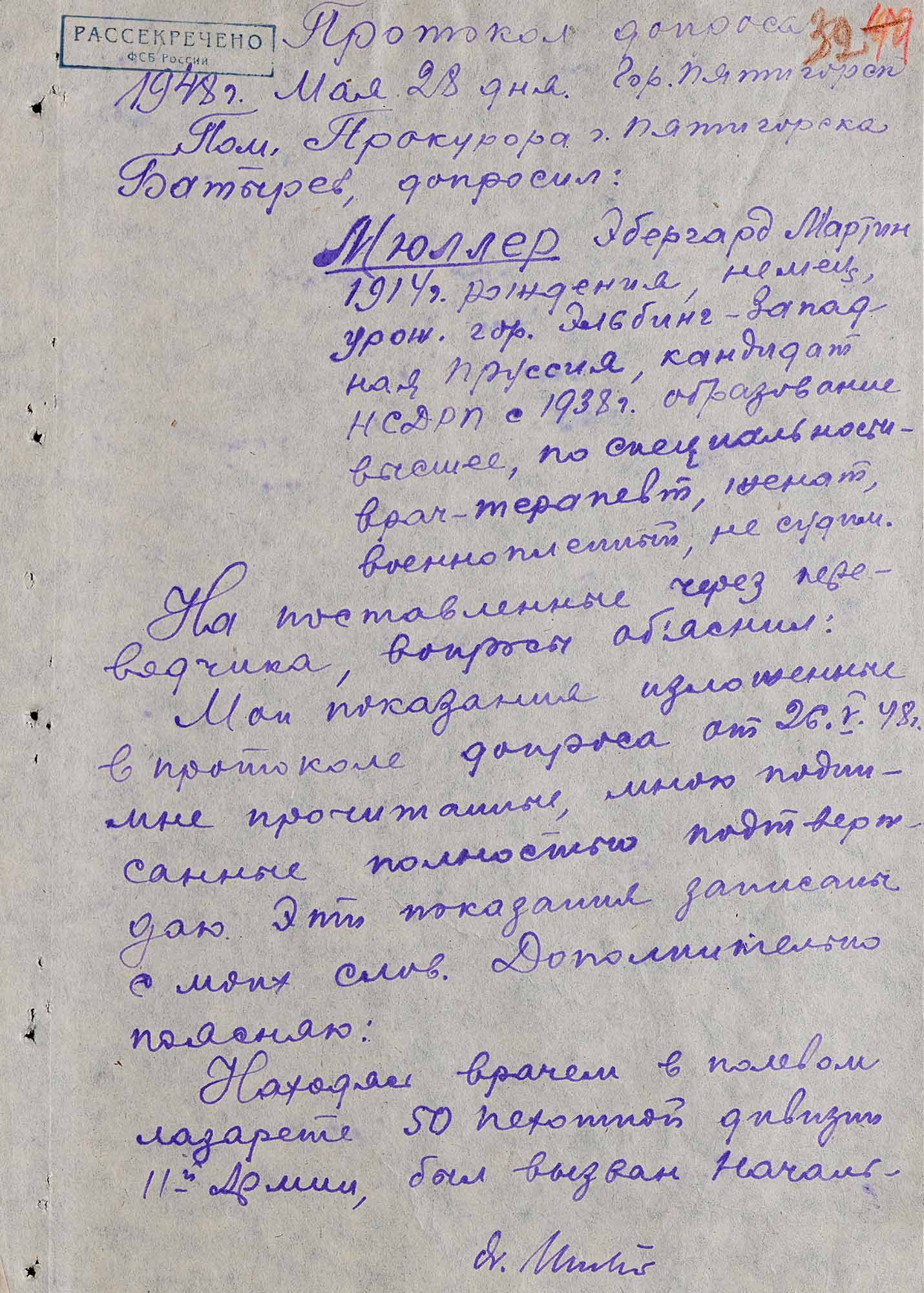 Протокол допроса капитана медицинской службы Э. Мюллера. 28 мая 1948 г. Пятигорск.