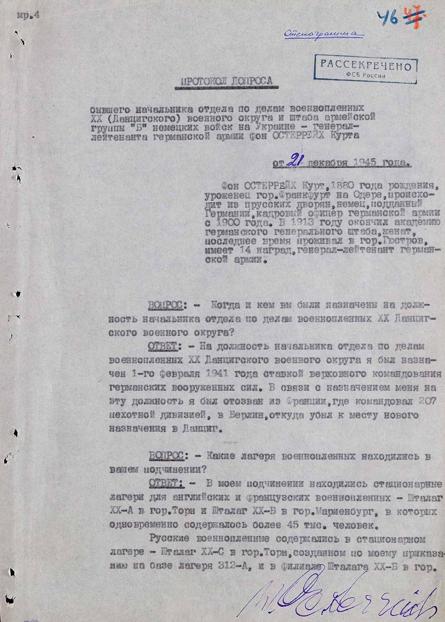 № 2. Протокол допроса генерал-лейтенанта К. фон Остеррайха. 21 декабря 1945 г. Москва.