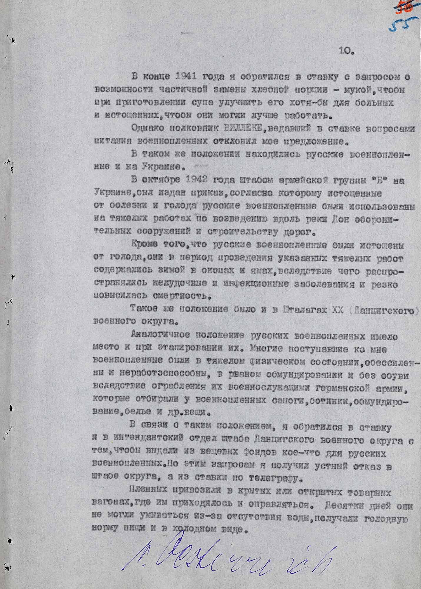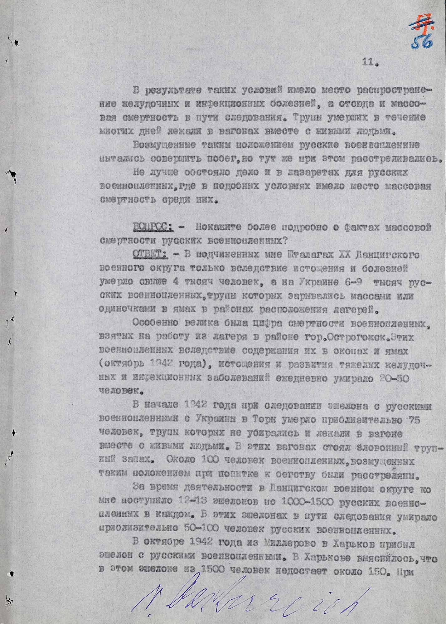 «С осени 1941 г., когда начали поступать первые русские пленные и до середины 1943 г., когда я ушел в отставку, только в „Шталаге ХХ-С“, насколько я могу припомнить из донесений, поступавших ко мне, умерли до 6 тысяч русских пленных. Подавляющее большинство из них умерло от истощения и заразных болезней (дизентерия, тиф и другие). Многие из умерших были похоронены в массовых могилах без указания фамилий и имен погребенных, а лишь их лагерных номеров [...].