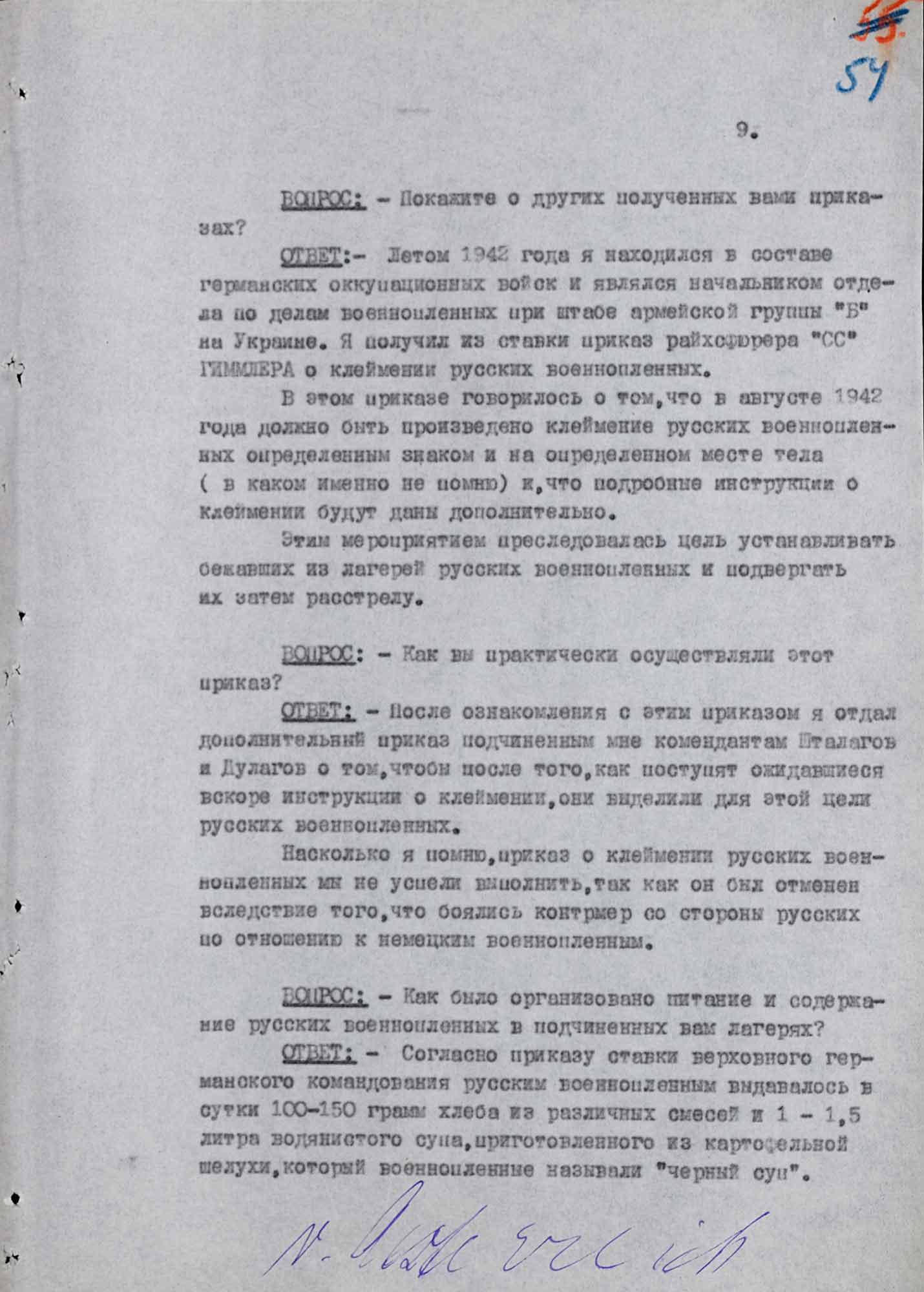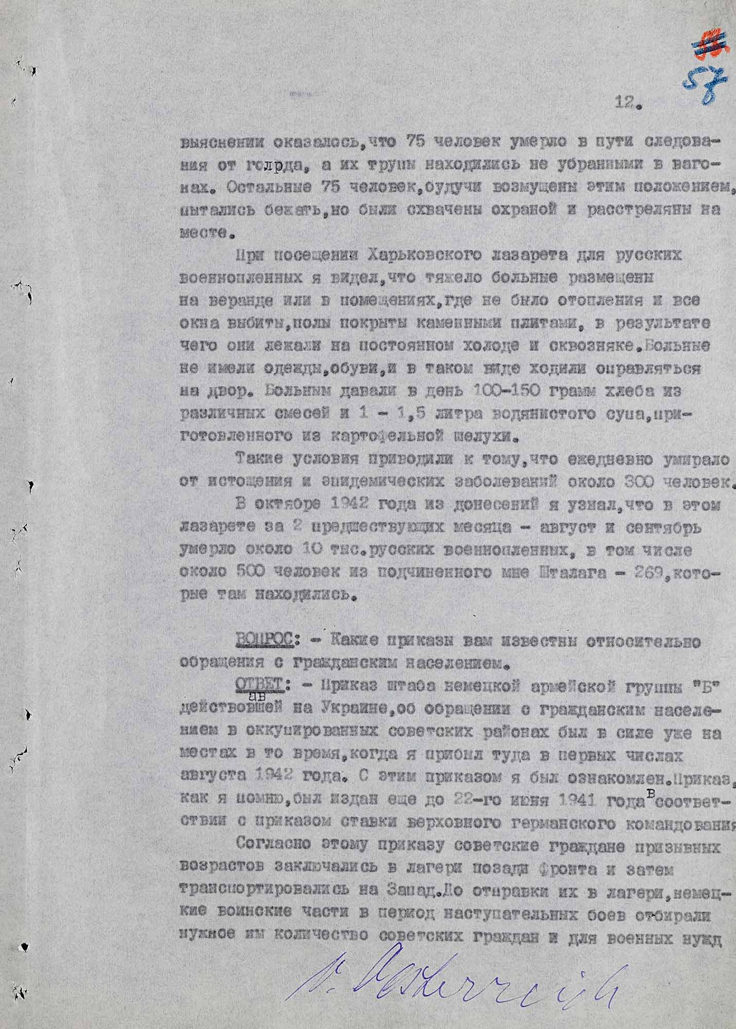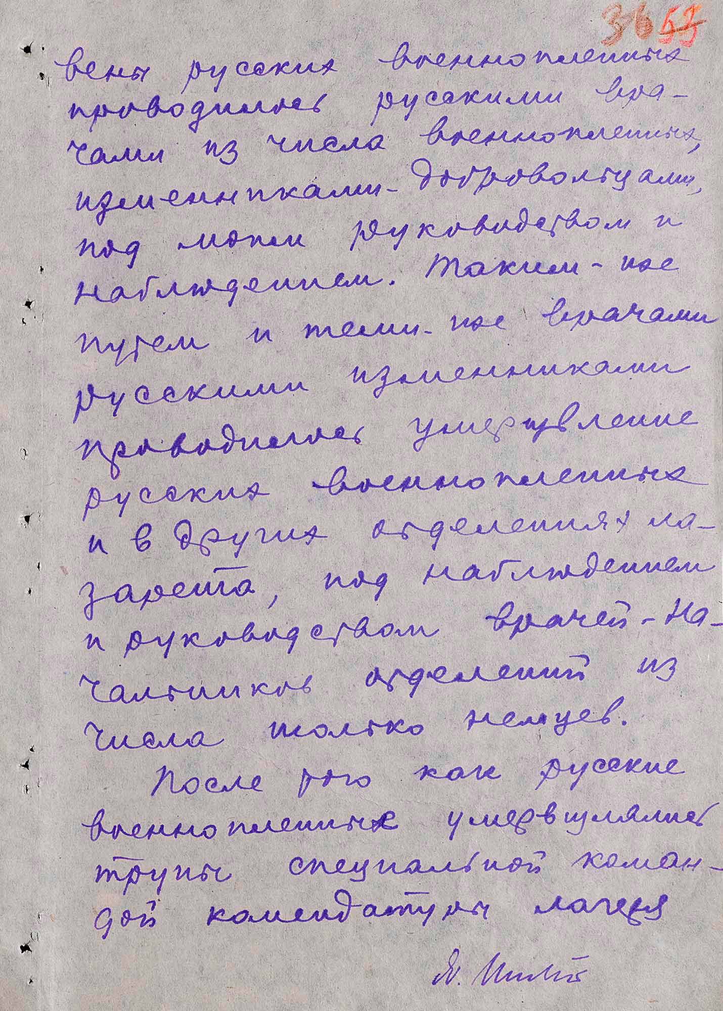 «Мне известно, что до моей работы в лагере было умерщвлено 1500–1600 русских военнопленных за период с января по 14 июня 1942 года. Умерщвление пленных в большом количестве началось с момента моего поступления на работу. Таким образом за 8 месяцев существования лагеря было умерщвлено 2500 русских военнопленных.