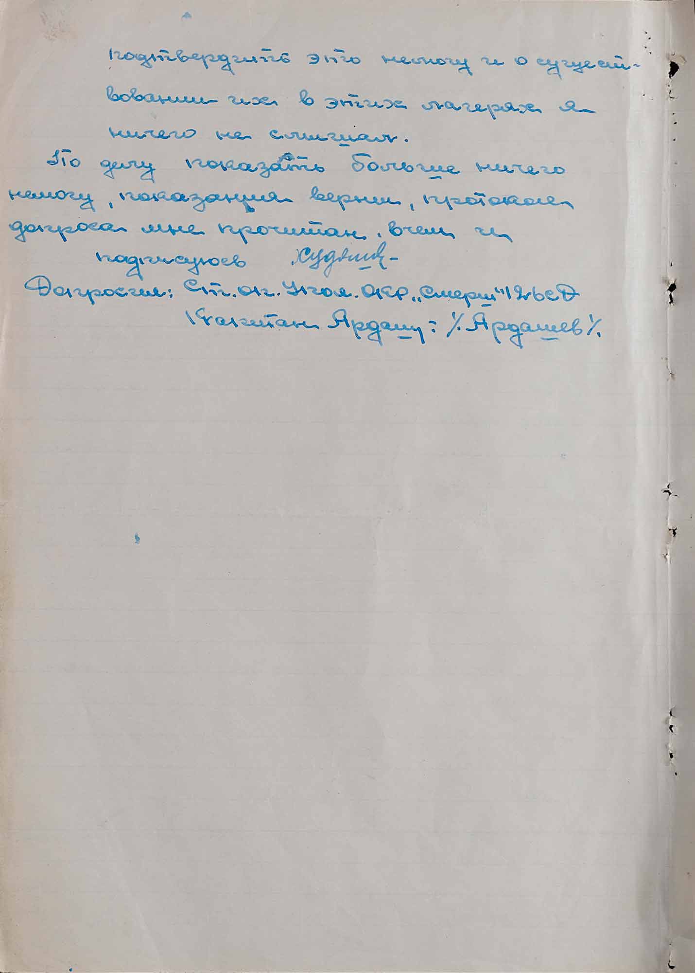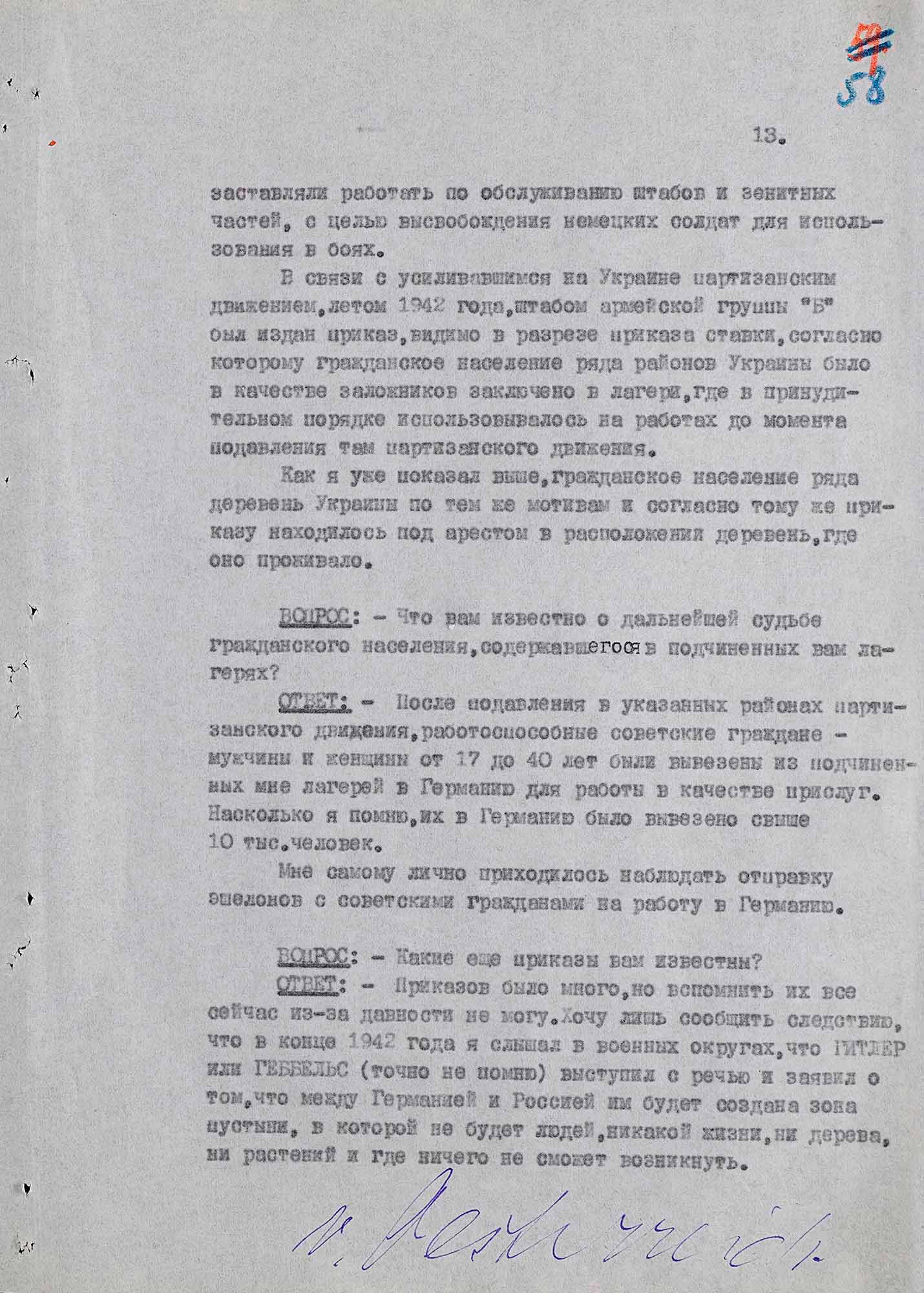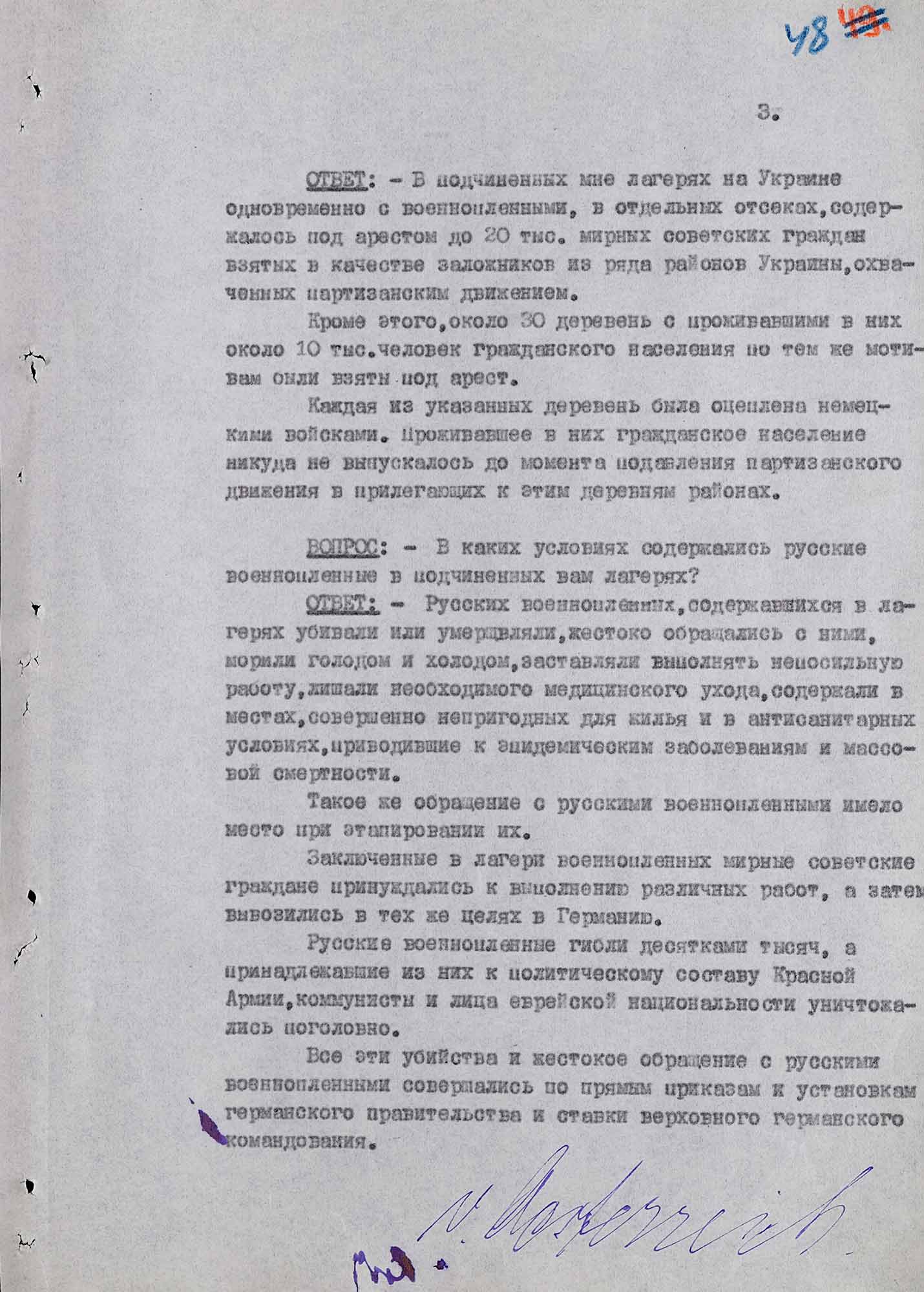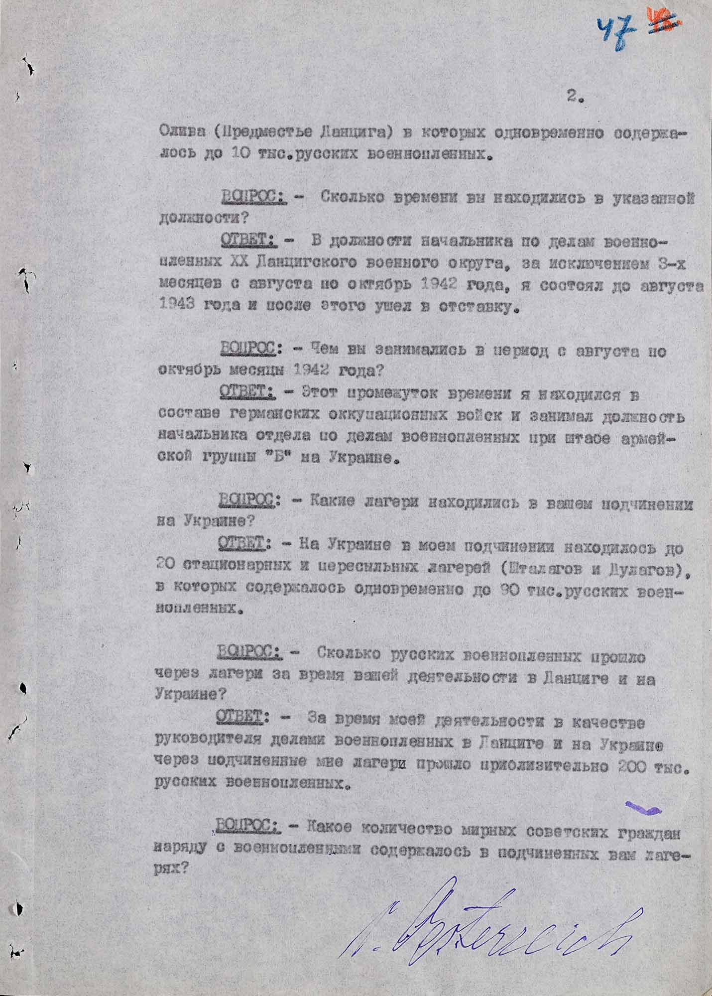 «Мне известно, что до моей работы в лагере было умерщвлено 1500–1600 русских военнопленных за период с января по 14 июня 1942 года. Умерщвление пленных в большом количестве началось с момента моего поступления на работу. Таким образом за 8 месяцев существования лагеря было умерщвлено 2500 русских военнопленных.