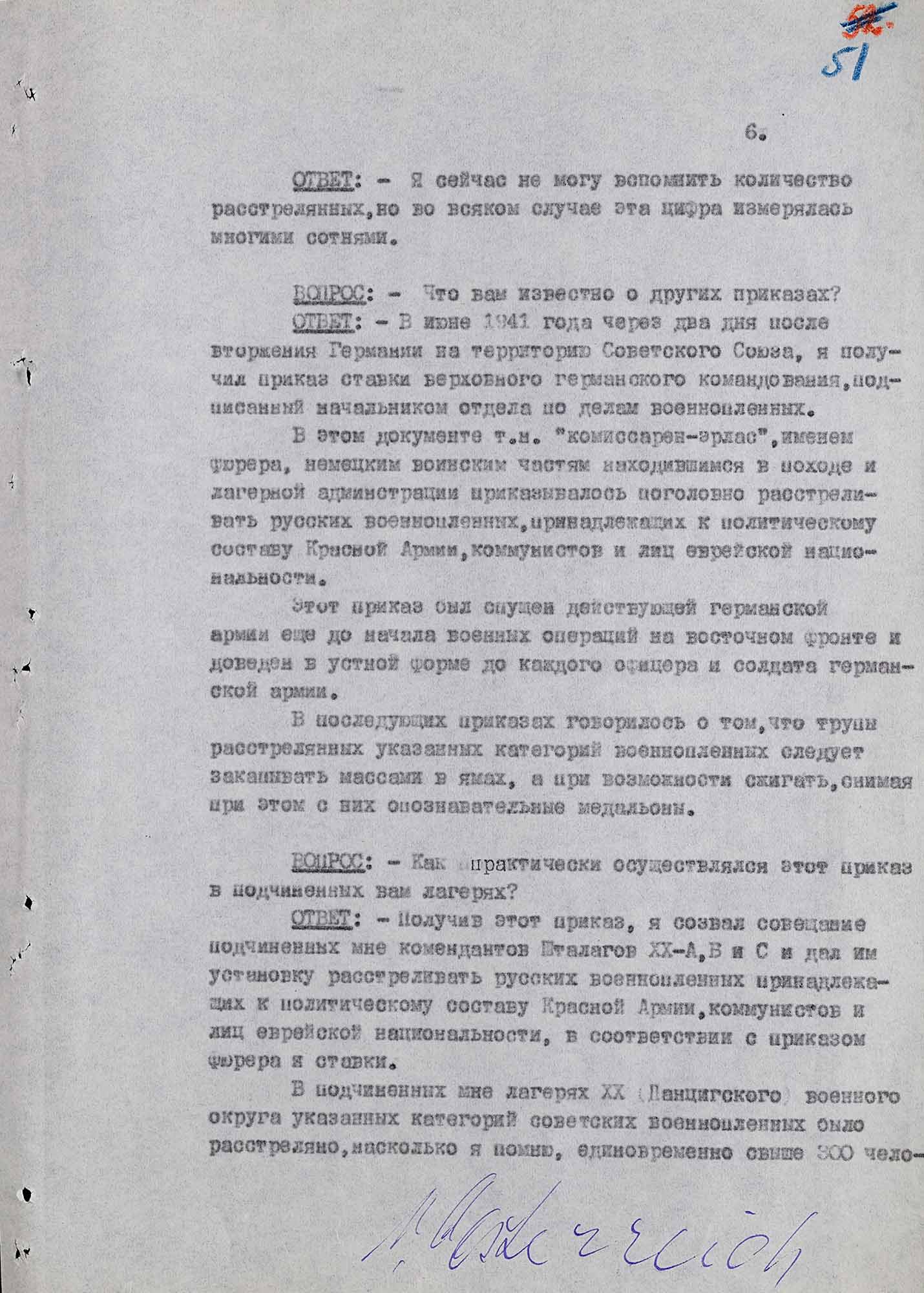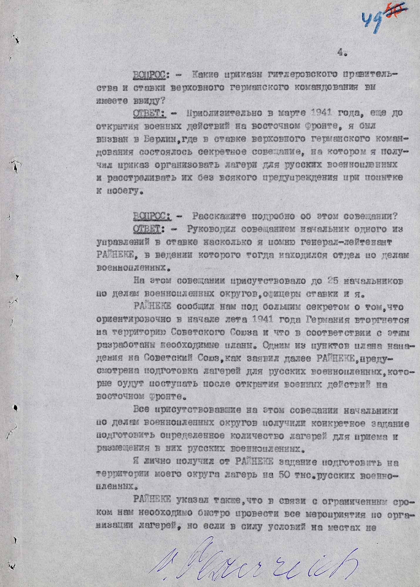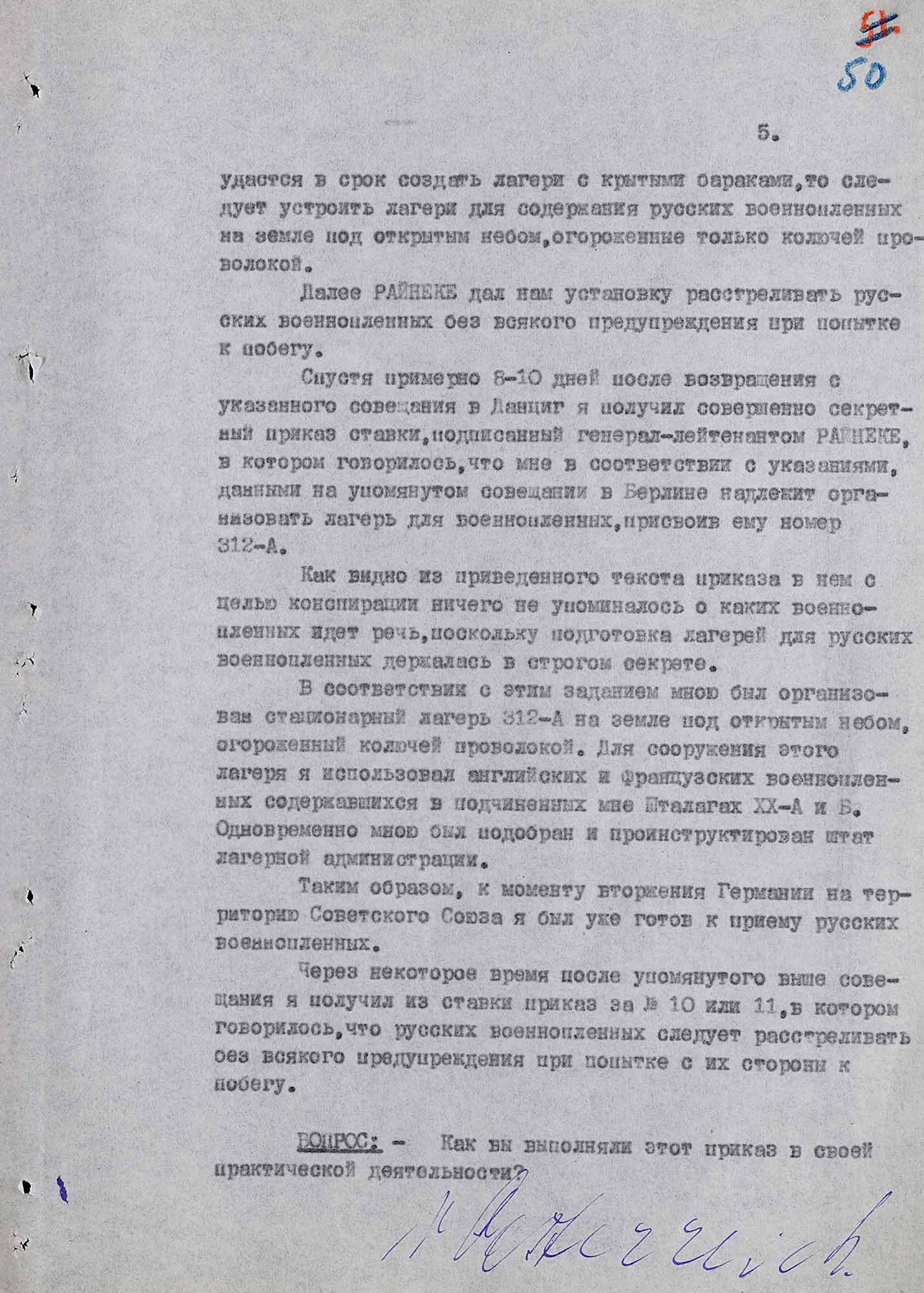 «[...] Приблизительно в марте 1941 года, еще до открытия военных действий на восточном фронте, я был вызван в Берлин, где в ставке верховного командования состоялось секретное совещание, на котором я получил приказ организовать лагеря для русских военнопленных и расстреливать их без всякого предупреждения при попытке к побегу [...].