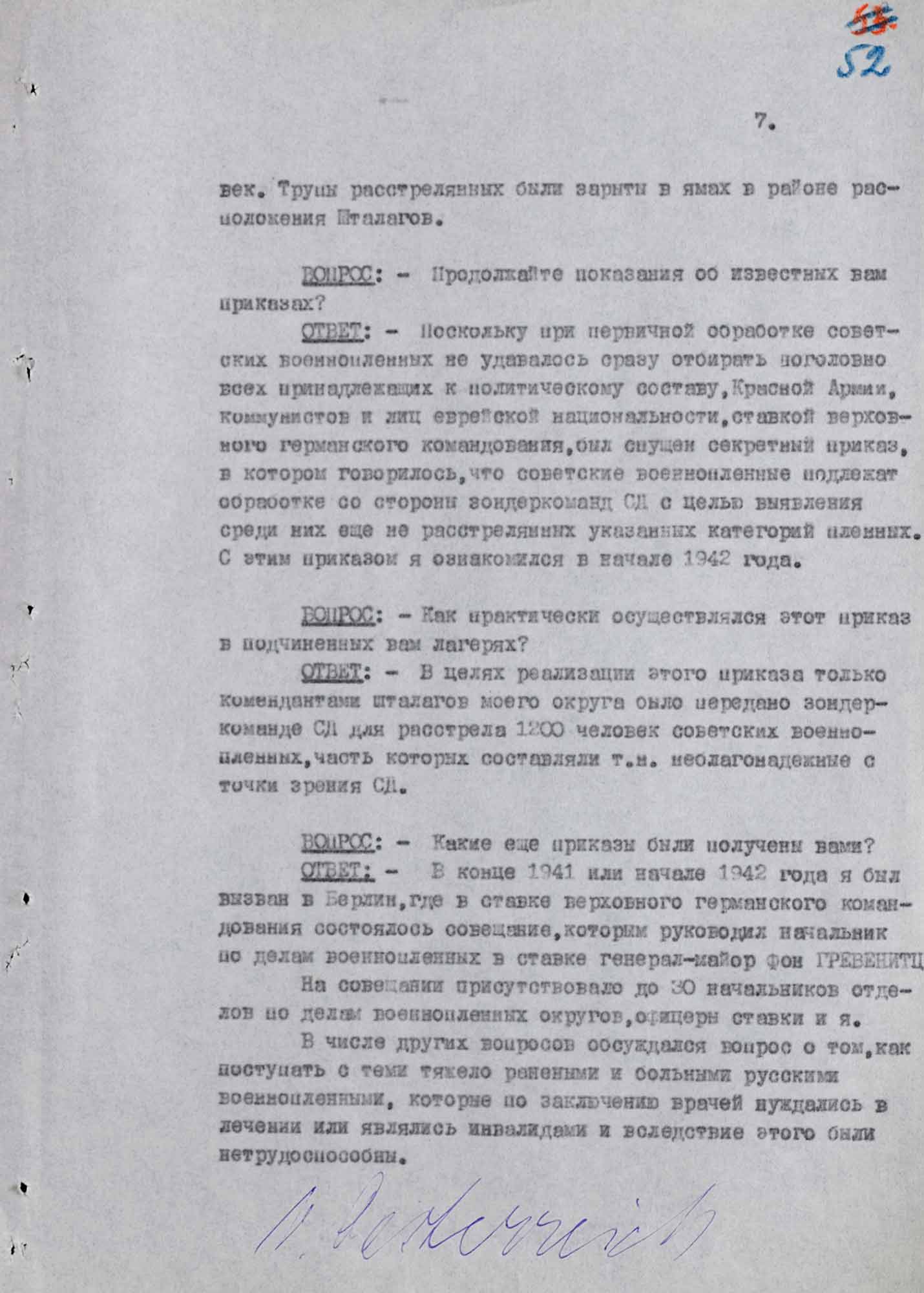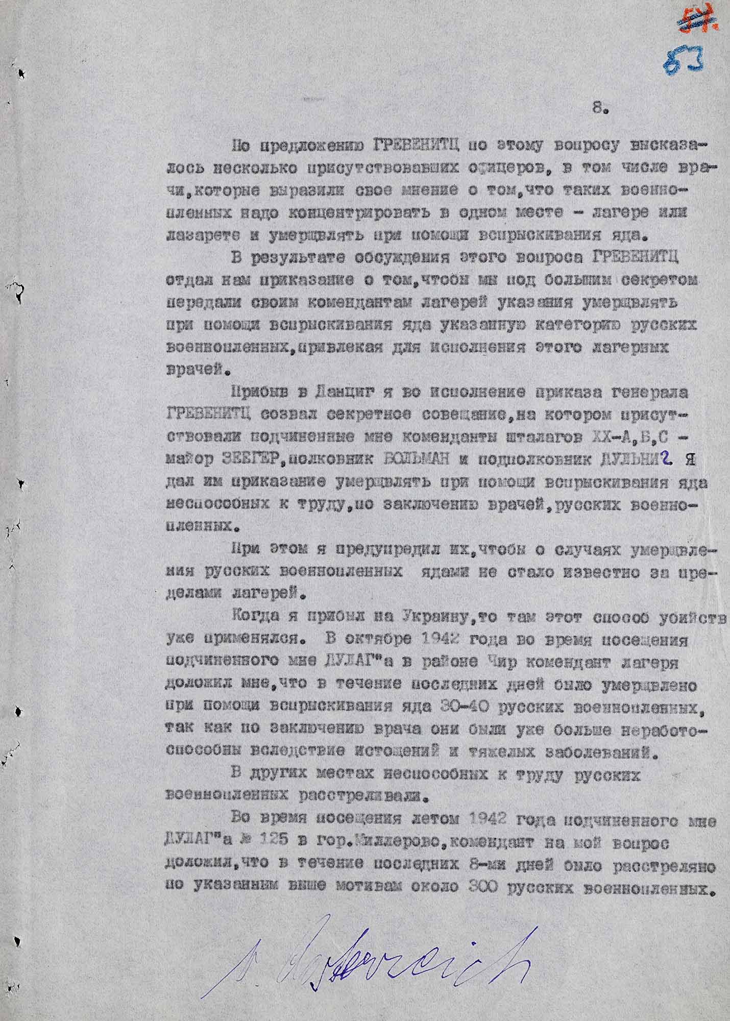 «[...] Этот вопрос был поднят на совещании начальников отделов военнопленных, состоявшемся весной 1942 года в гор. Берлин и представитель OKW (ОКВ, Верховное командование вермахта — сост.) — штаба Главного командования вооруженных сил Германии генерал-майором [Гансом] фон Гревенитц дал нам указания уничтожать т.н. „нежизнеспособных“ военнопленных путем впрыскивания яда [...].