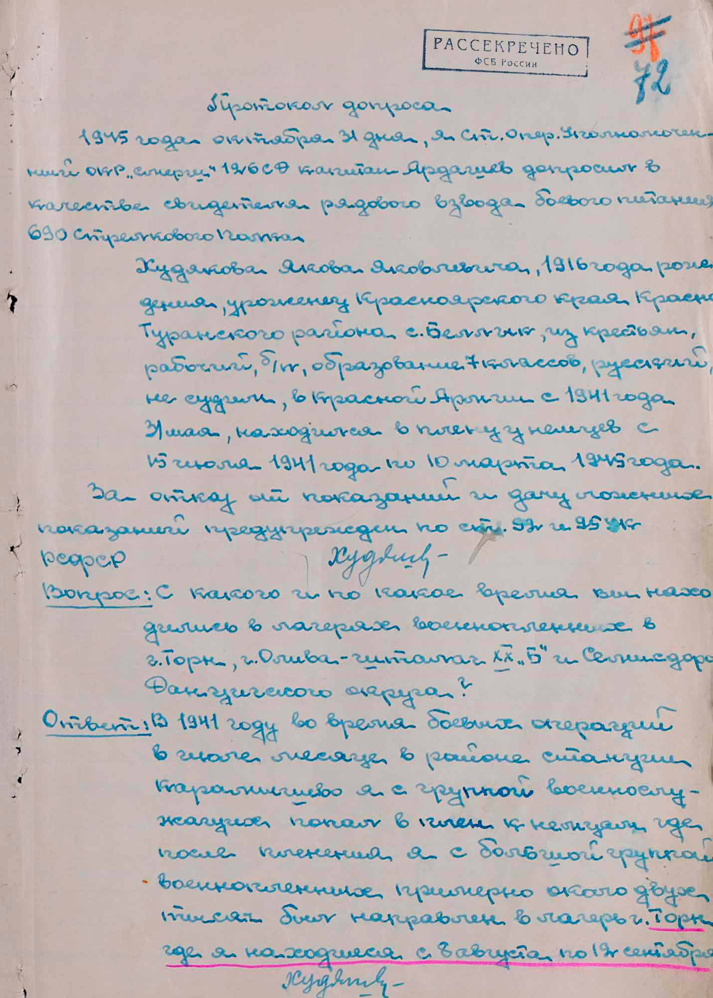 Протокол допроса свидетеля рядового Якова Худякова. 31 октября 1945 г. Северная группа войск.