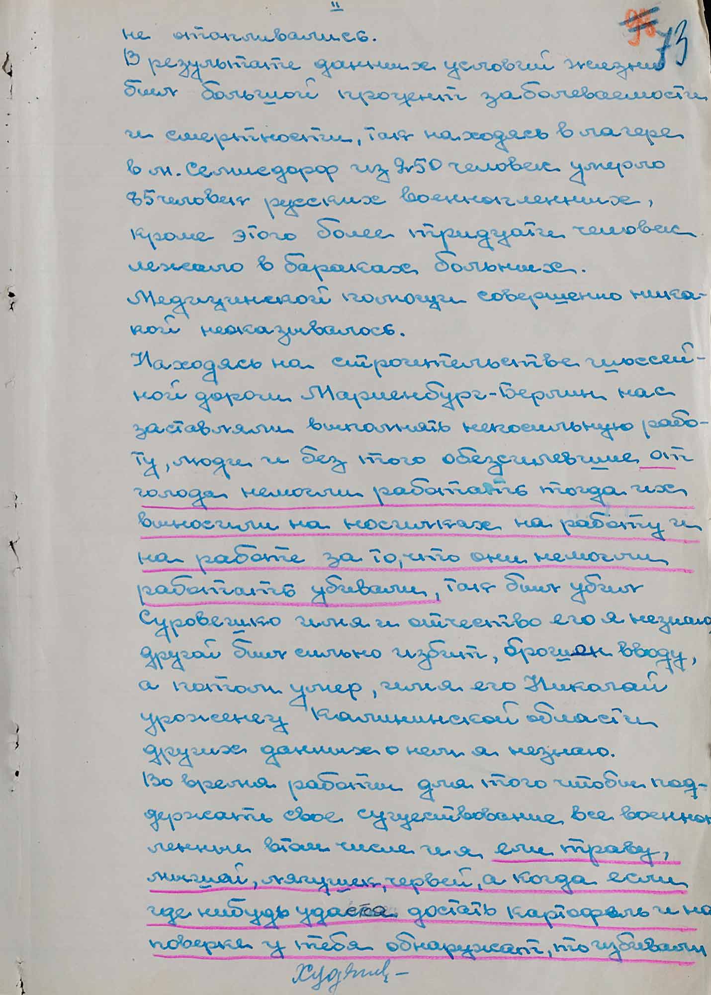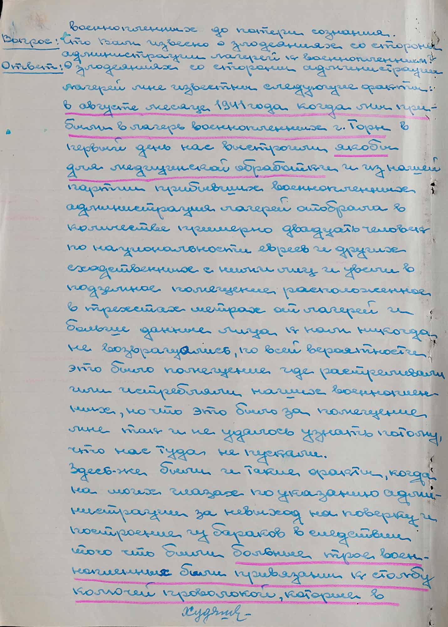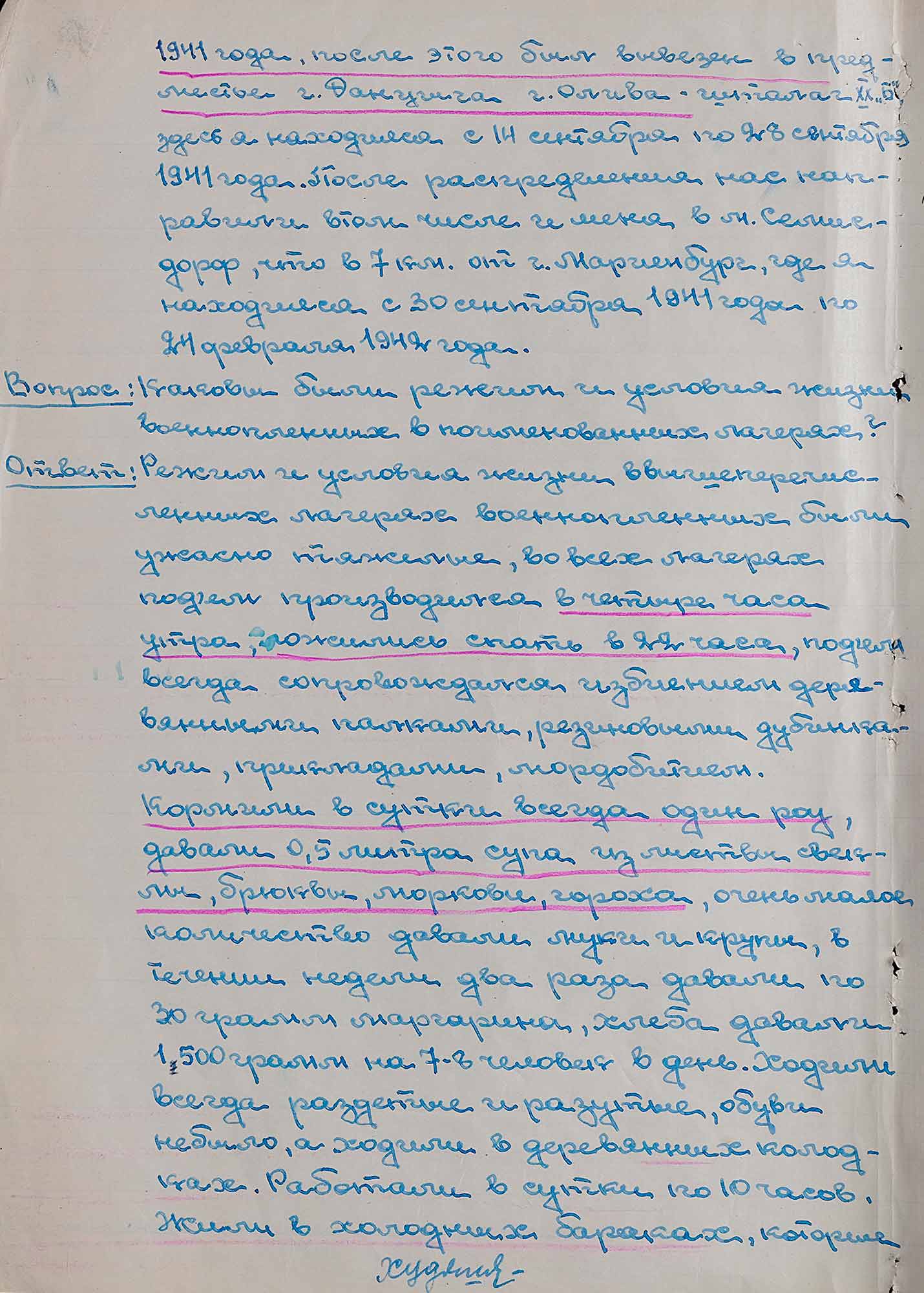 «[...] Во время работы для того, чтобы поддержать свое существование все военнопленные, в том числе и я, ели траву, мышей, лягушек, червей, а когда если где-нибудь удастся достать картофель и на поверке у тебя обнаружат, то избивали военнопленных до потери сознания [...].