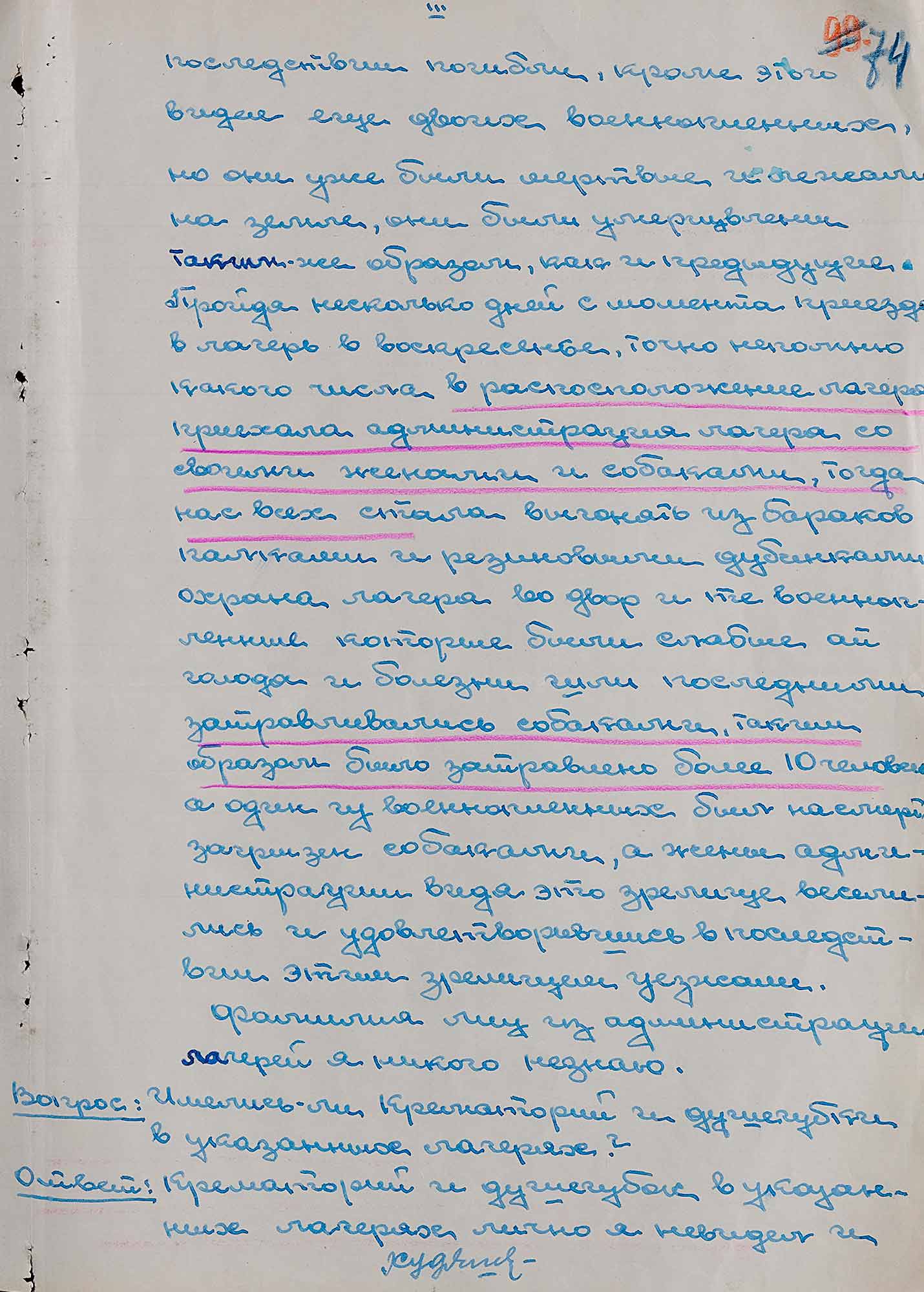 [...] в воскресенье, точно не помню какого числа, в расположение лагеря приехала администрация лагеря со своими женами и собаками, тогда нас всех стали выгонять из бараков палками и резиновыми дубинками охрана лагеря во двор, и те военнопленные, которые были слабже от голода и болезней шли последними, затравливались собаками, таким образом было затравлено более 10 человек, а один из военнопленных был насмерть загрызен собаками, а жены администрации, видя это зрелище, веселились и, удовлетворившись впоследствии этим зрелищем, уезжали [...]».