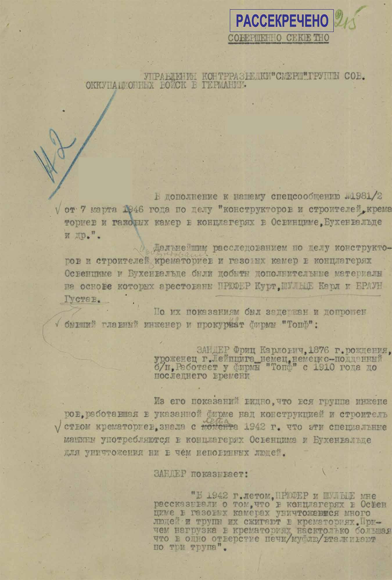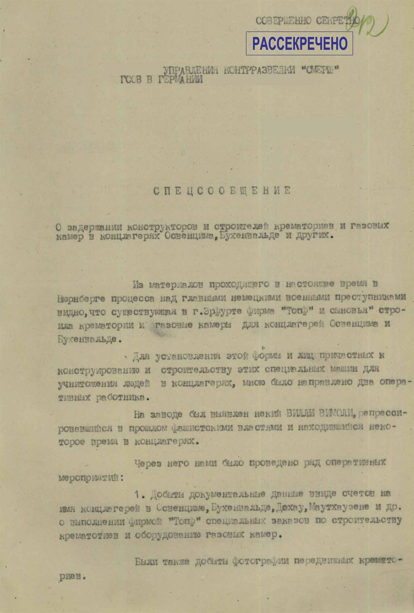 Спецсообщение Отдела контрразведки «Смерш» 8-й гвардейской армии в Управление контрразведки «Смерш» Группы советских оккупационных войск в Германии «О задержании конструкторов и строителей крематориев и газовых камер в концлагерях Освенцим, Бухенвальд и других», от 7 марта 1946 г.