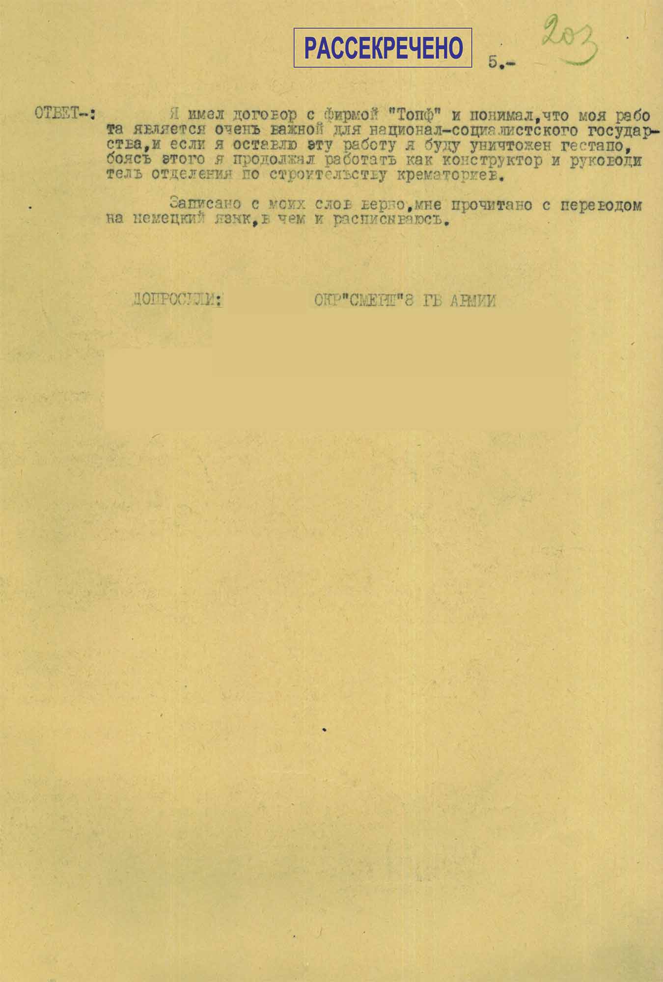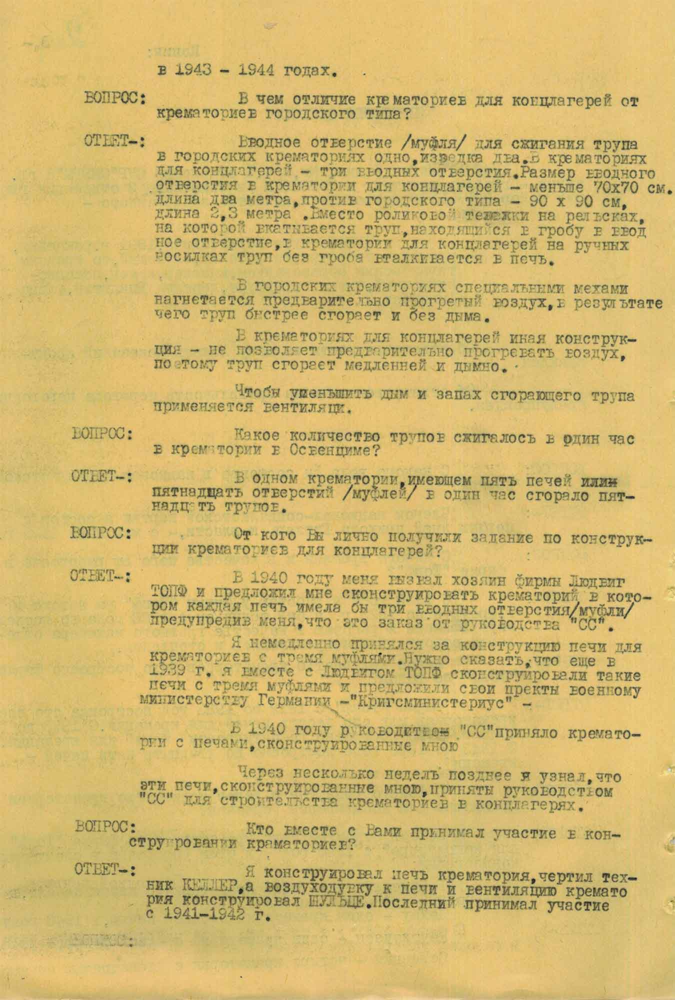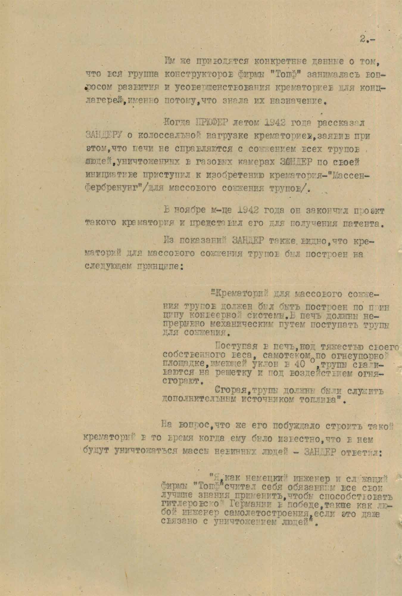 Главный инженер и прокурист [доверенное лицо предприятия, которое имеет полномочия на совершение различных сделок от имени собственника — сост.] завода Фриц Зандер на вопрос следователя ОКР «Смерш» о моральной стороне проектирования крематориев для концлагерей, ответил: «Я, как немецкий инженер и служащий фирмы „Топф“, считал себя обязанным все свои лучшие знания применить, чтобы способствовать гитлеровской Германии в победе, также, как любой инженер по самолетостроению, если это связано даже с уничтожением людей».