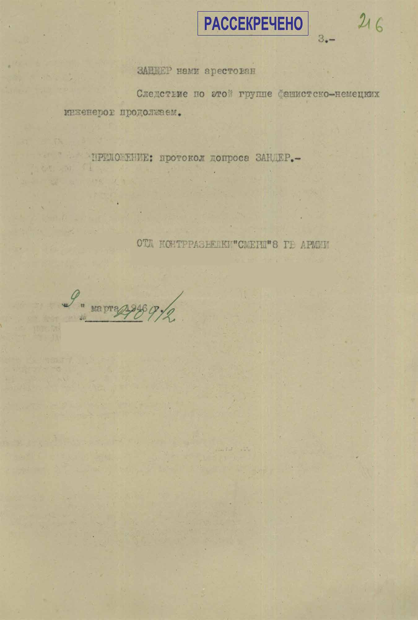 Спецсообщение Отдела контрразведки «Смерш» 8-й гвардейской армии в Управление контрразведки «Смерш» Группы советских оккупационных войск в Германии «О дальнейшем расследовании по делу конструкторов и строителей крематориев и газовых камер для концлагерей Освенцим, Бухенвальд и других», от 9 марта 1946 г.