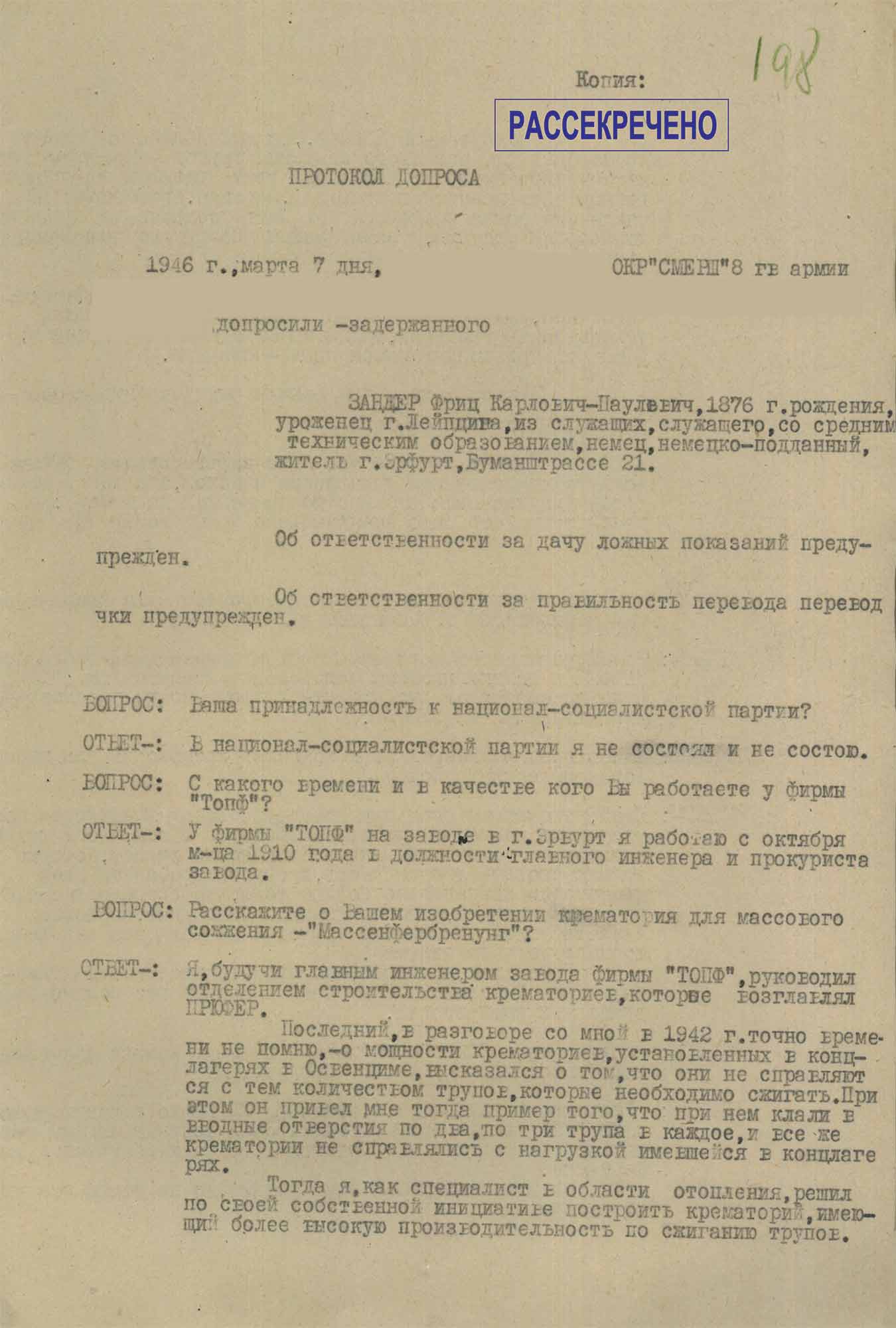 Протокол допроса служащего компании «Топф и сыновья» Зандера Ф.К.-Н., от 7 марта 1946 г.