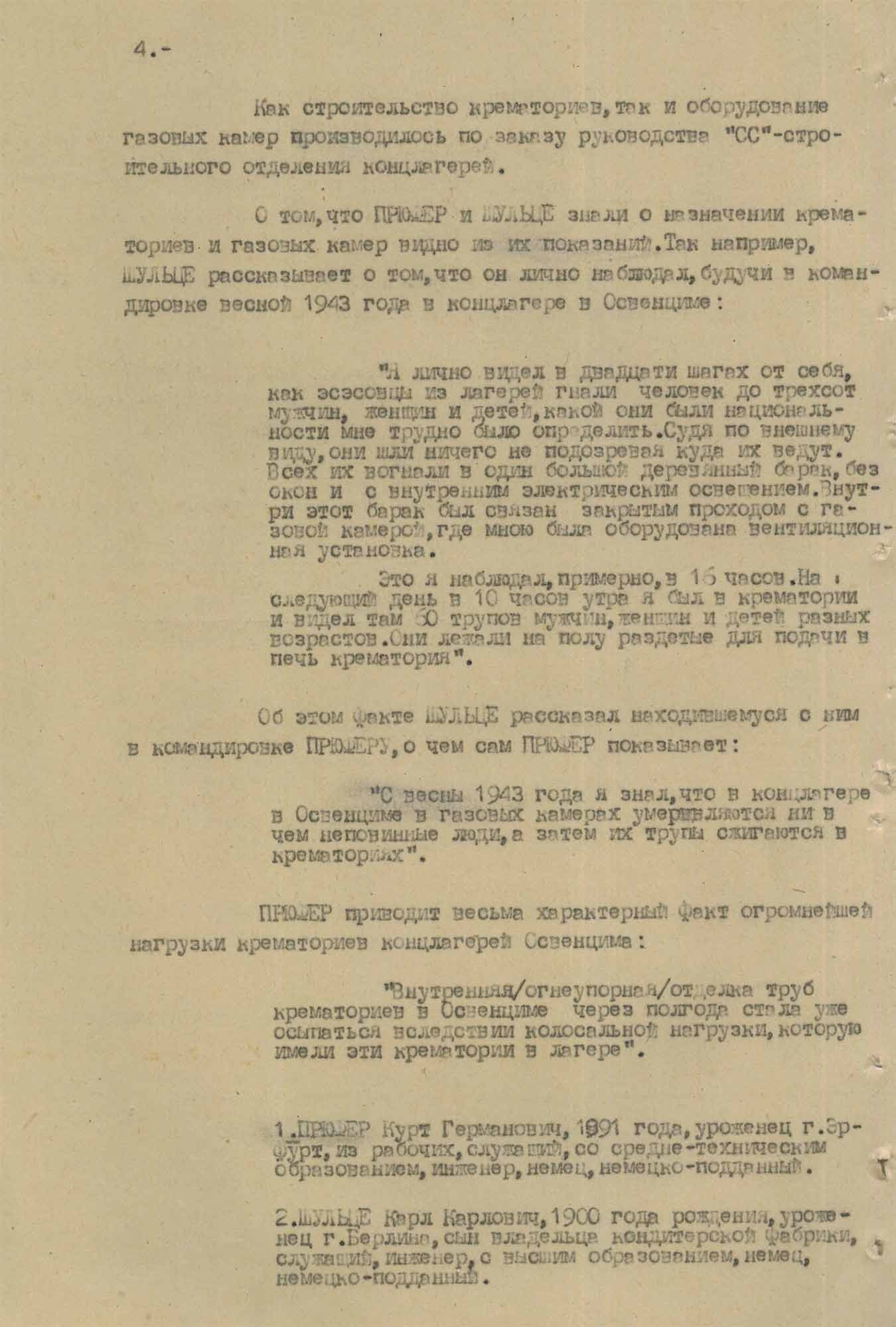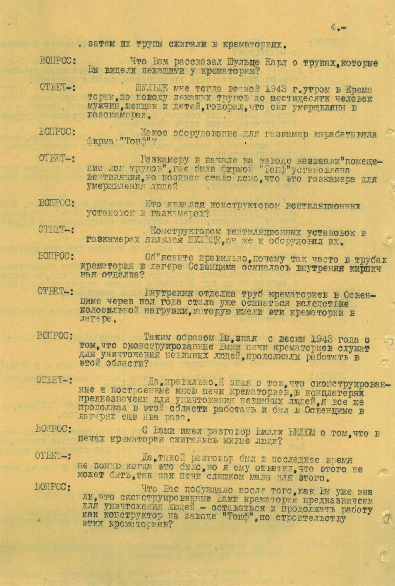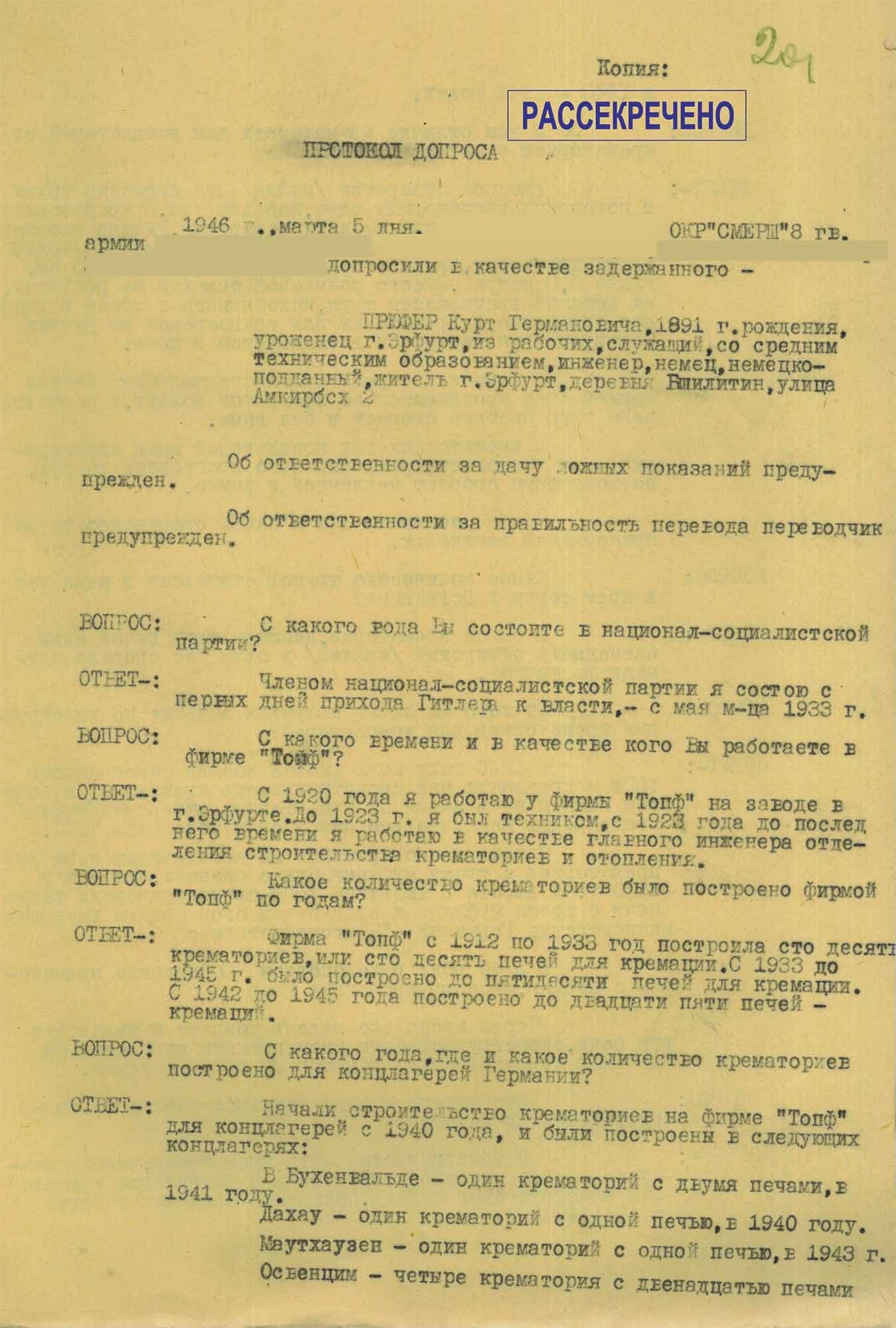 № 4. Протокол допроса служащего компании «Топф и сыновья» Прюфера К.Г., от 5 марта 1946 г.