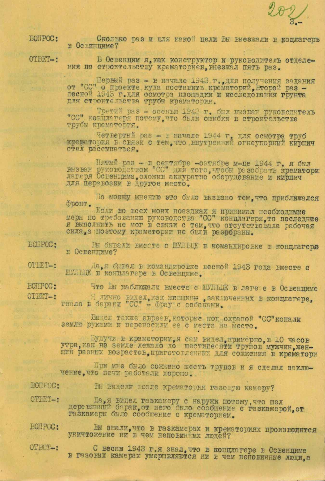 На вопрос следователя о причинах, которые побудили К. Шульце задержаться в командировке в Освенциме, он ответил: «Я задержался на пять дней из-за того, что не было транспорта с людьми, которые подлежат уничтожению, так как я должен был практически проверить работу печи крематория. Эту проверку мне удалось осуществить с прибытием указанных выше трехсот человек, умерщвленных в газовых камерах».