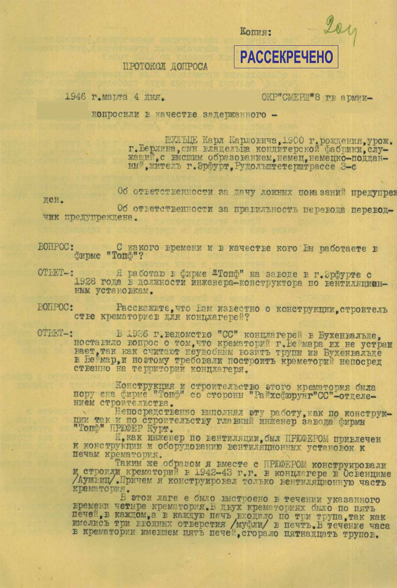 Протокол допроса служащего компании «Топф и сыновья» Шульце К.К., от 4 марта 1946 г.