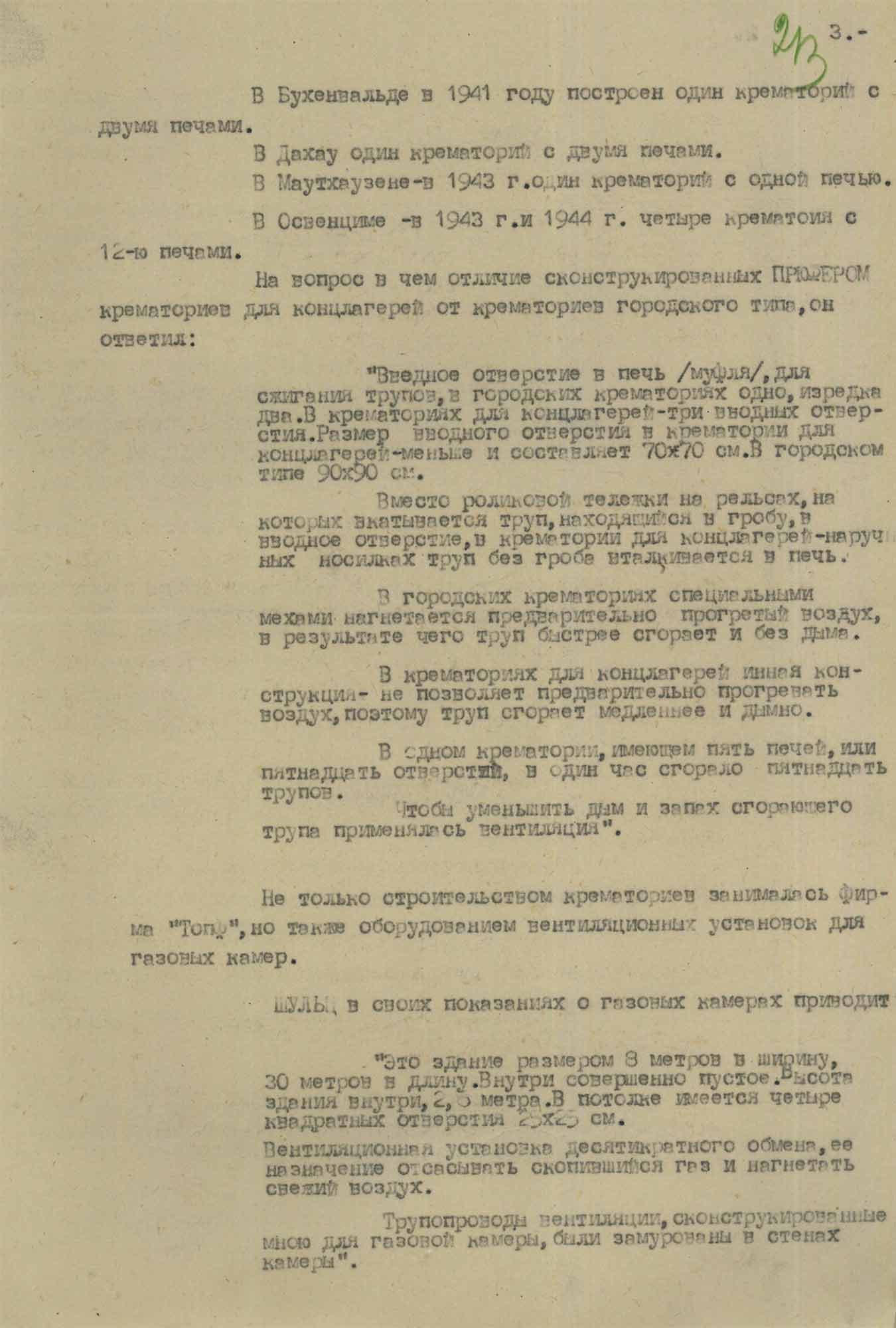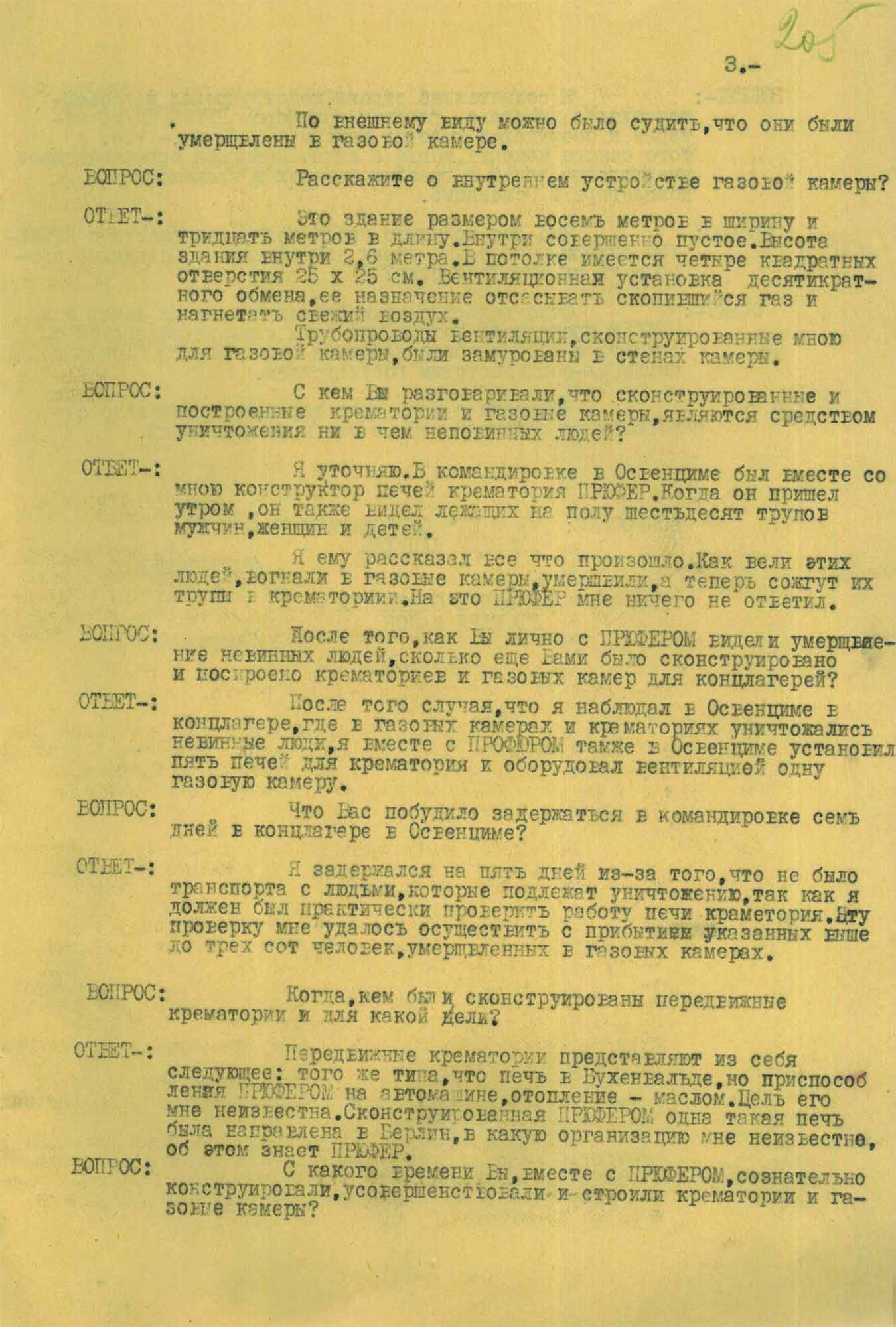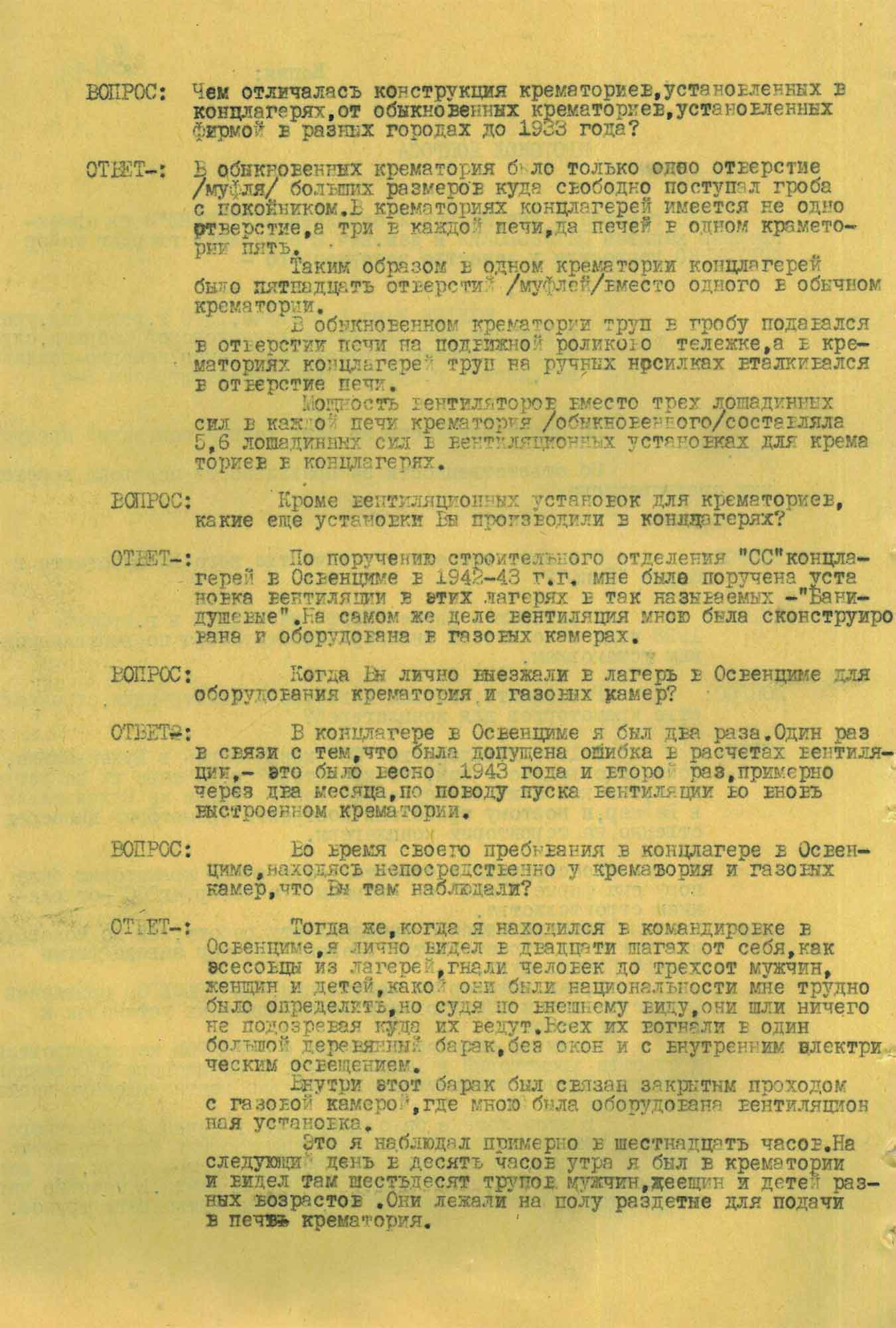 Это я наблюдал примерно в шестнадцать часов. На следующий день в десять часов утра я был в крематории и видел там шестьдесят трупов мужчин, женщин и детей разных возрастов. Они лежали на полу раздетые для подачи в печь крематория.