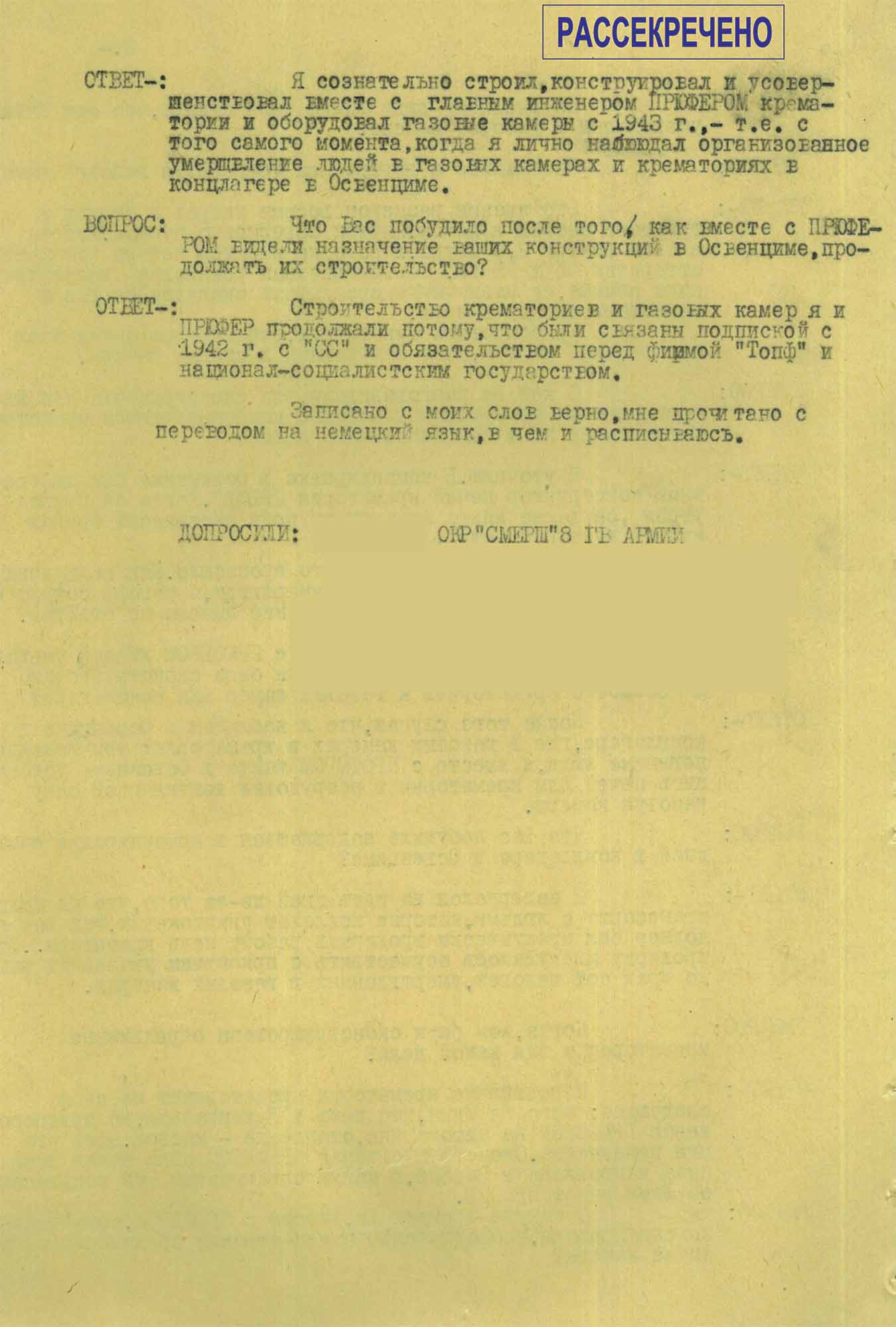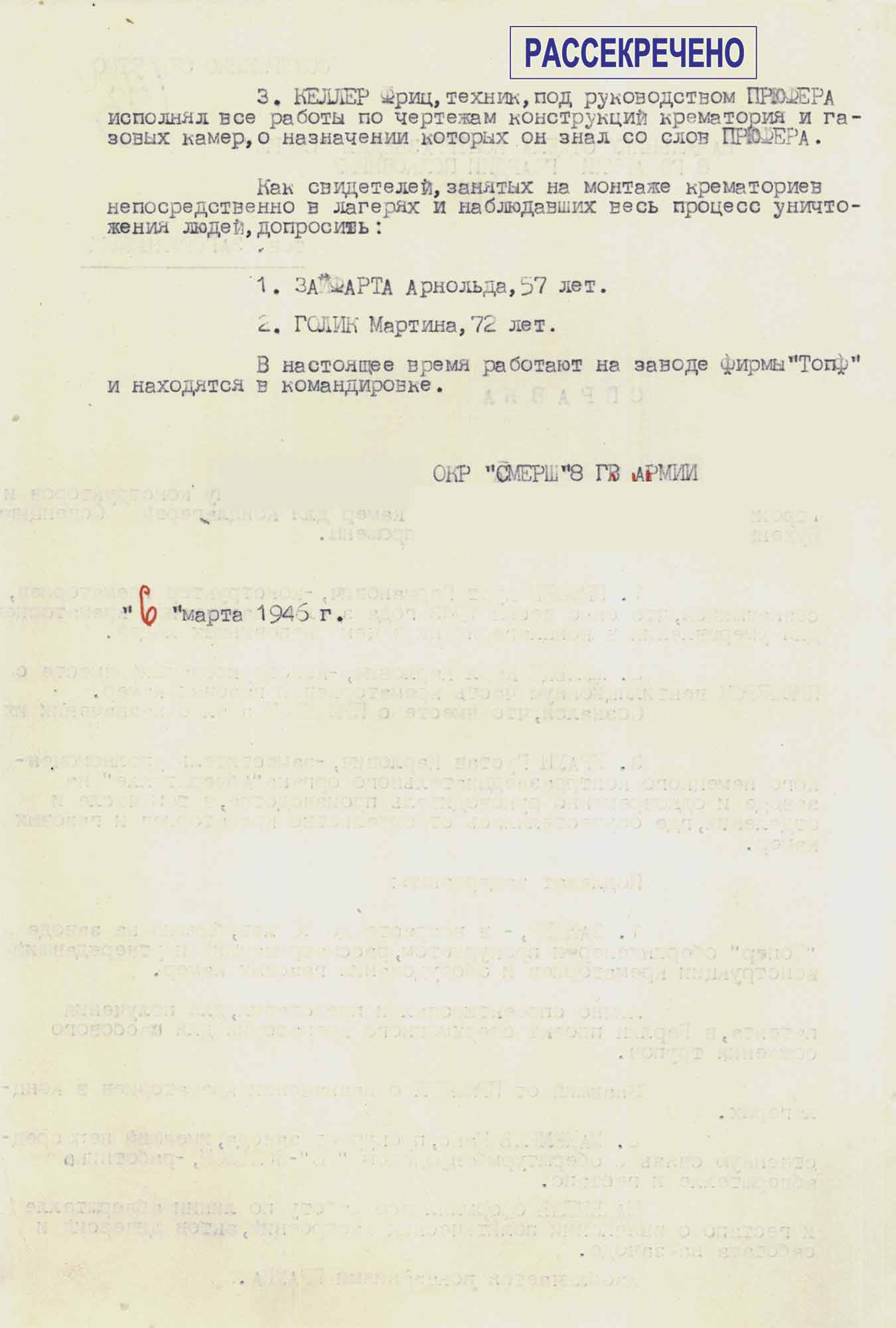 Весной 1946 года работниками оперативно-следственной группы отдела контрразведки «Смерш» 8-й гвардейской армии Группы советских оккупационных войск в Германии были задержаны служащие немецкой инженерной компании «Топф и сыновья», занимавшейся проектированием и строительством крематориев, а также оборудованием газовых камер в лагерях смерти «Аушвиц», «Дахау» и «Бухенвальд».