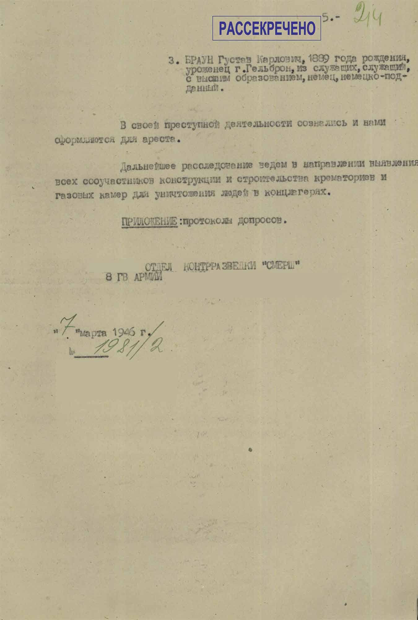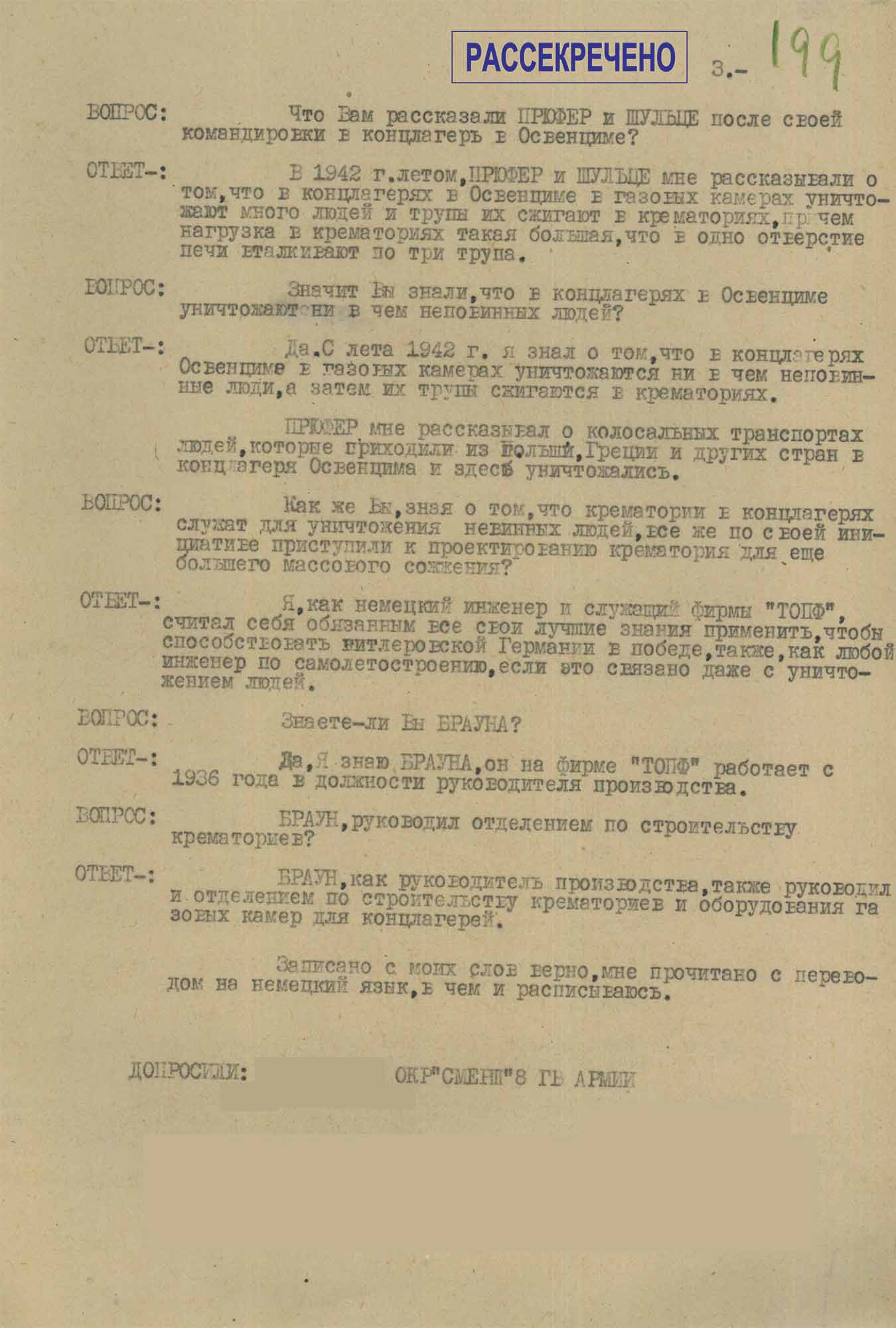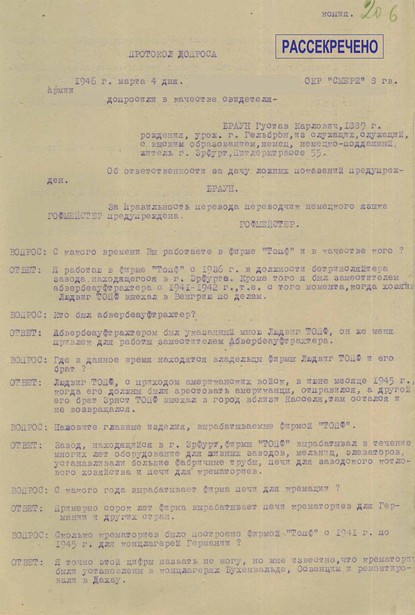 Протокол допроса служащего компании «Топф и сыновья» Брауна Г.К., от 4 марта 1946 г.
