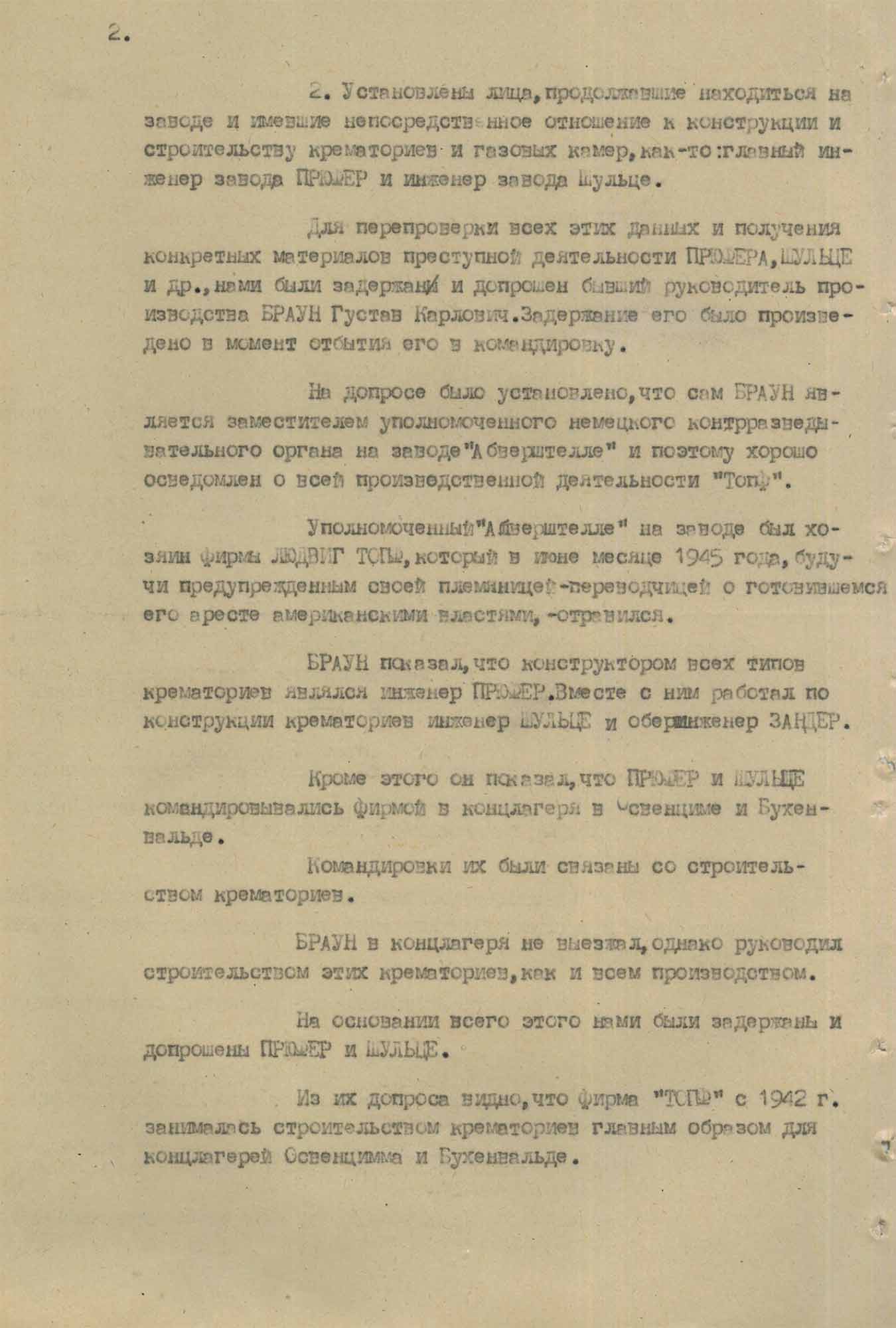 № 2. Протокол допроса служащего компании «Топф и сыновья» Брауна Г.К., от 4 марта 1946 г.