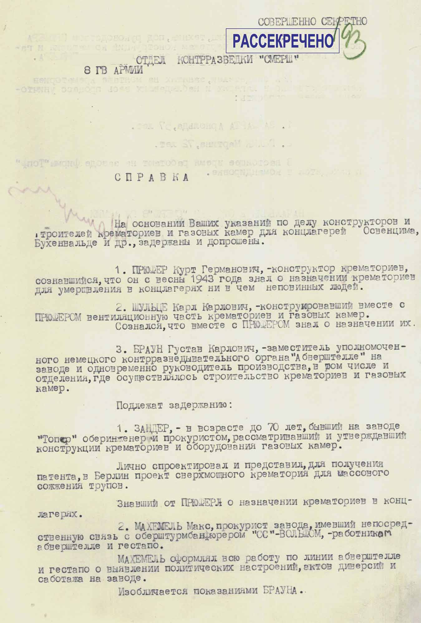 Справка Отдела контрразведки «Смерш» 8-й гвардейской армии Группы советских оккупационных войск в Германии «По делу конструкторов и строителей крематориев и газовых камер для концлагерей Освенцим, Бухенвальд и других», от 6 марта 1946 г.