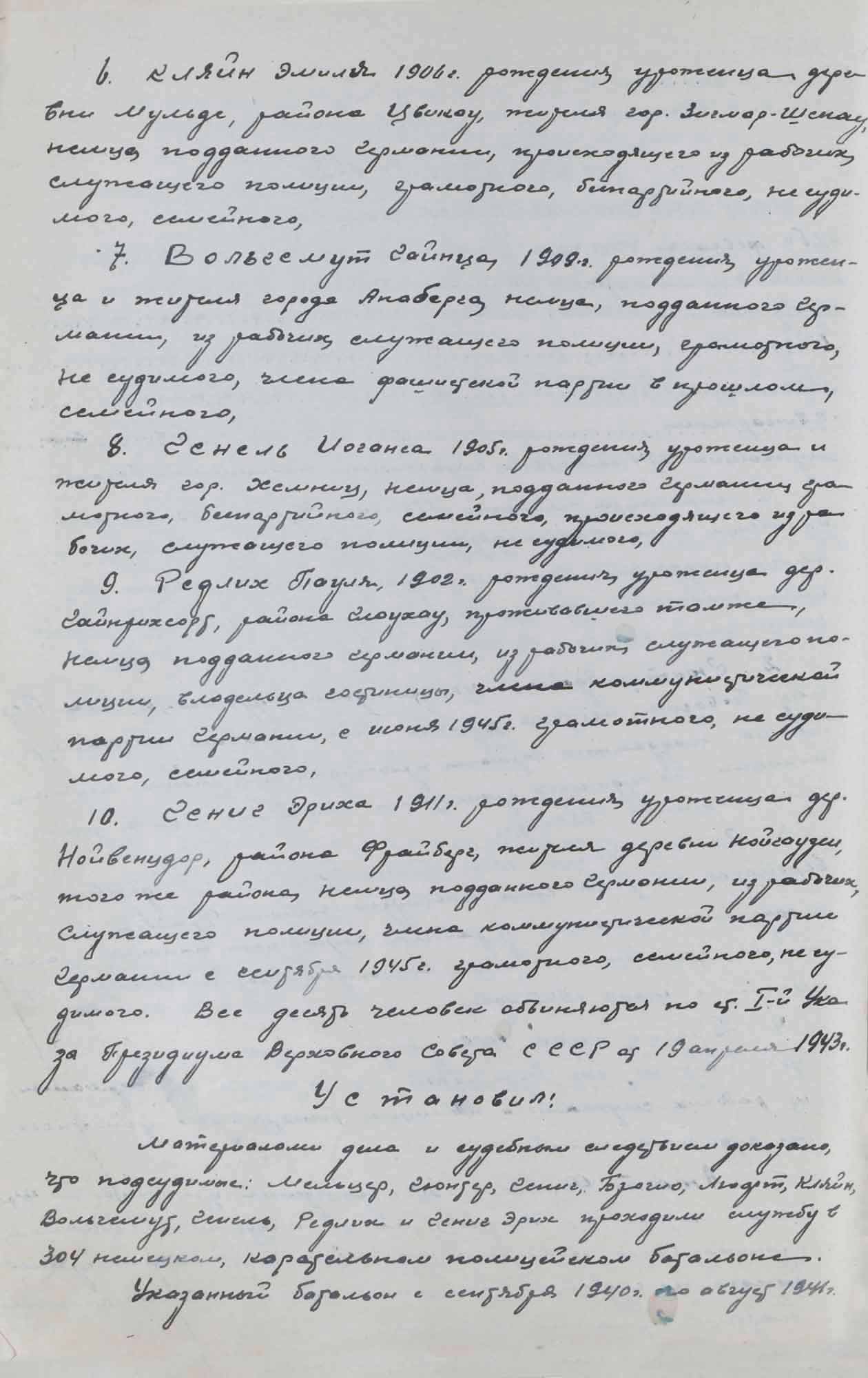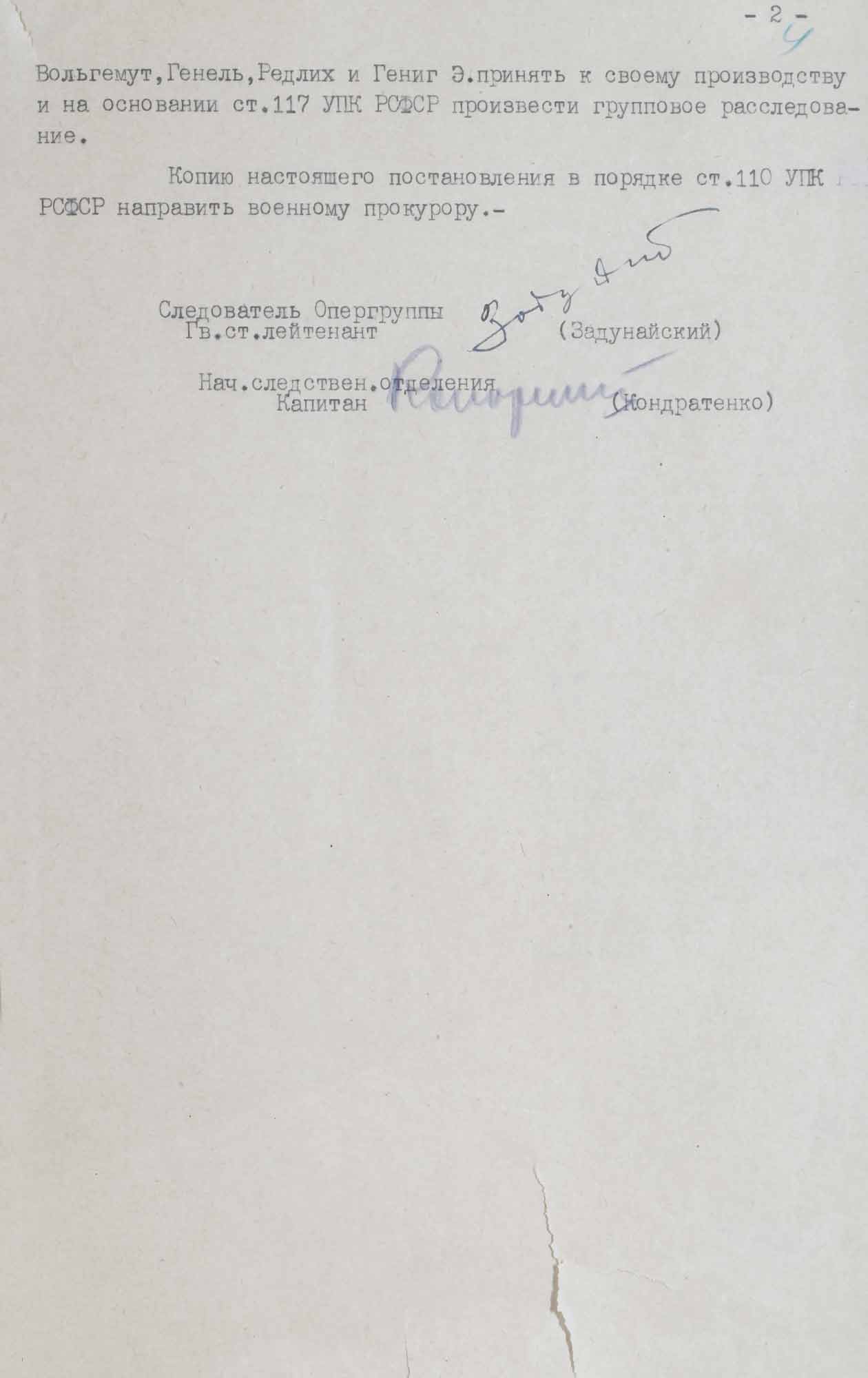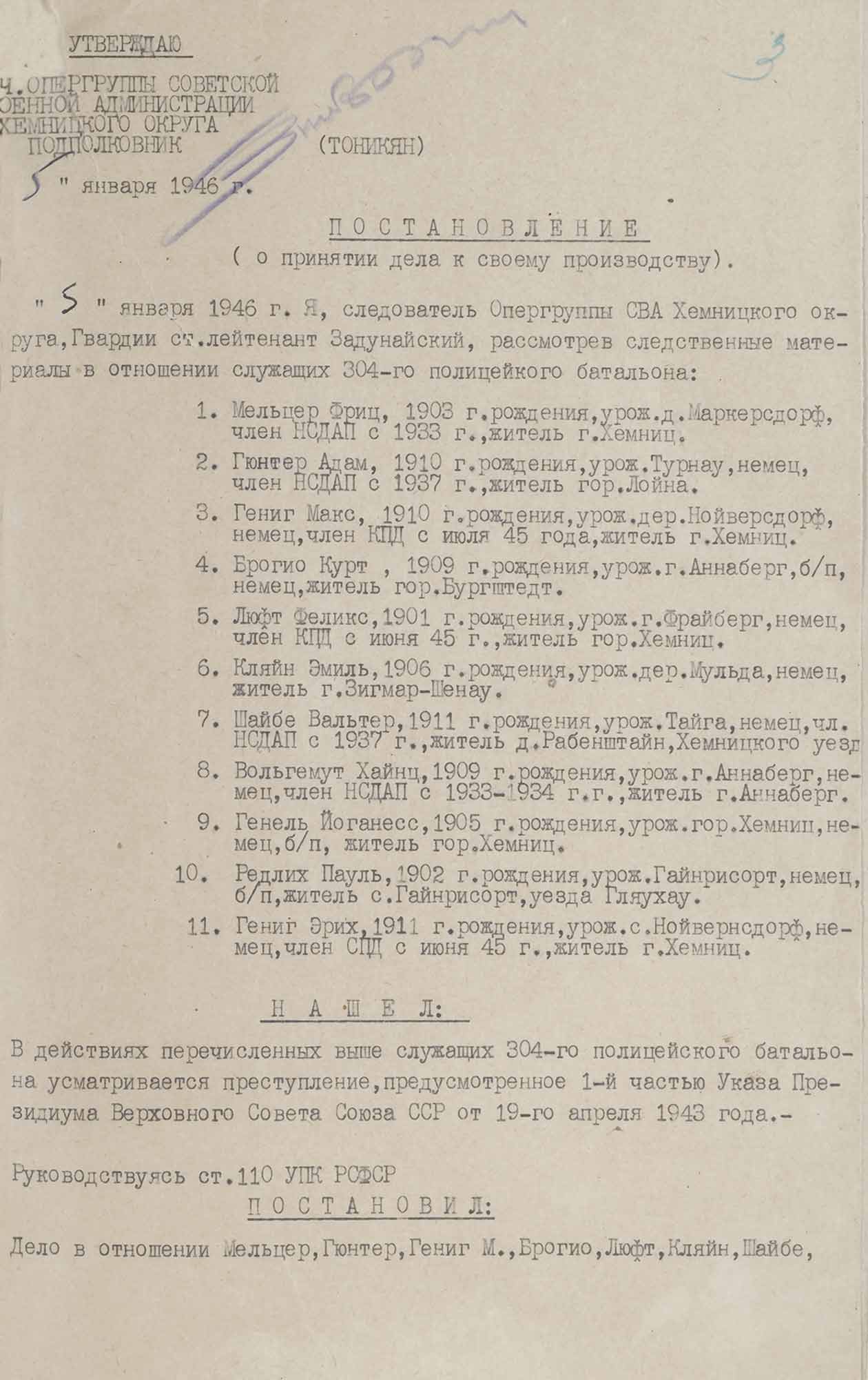 № 1. Постановление о принятии дела в отношении Мельцра Ф., Люфта Ф. и др. к производству. 5 января 1946 г.