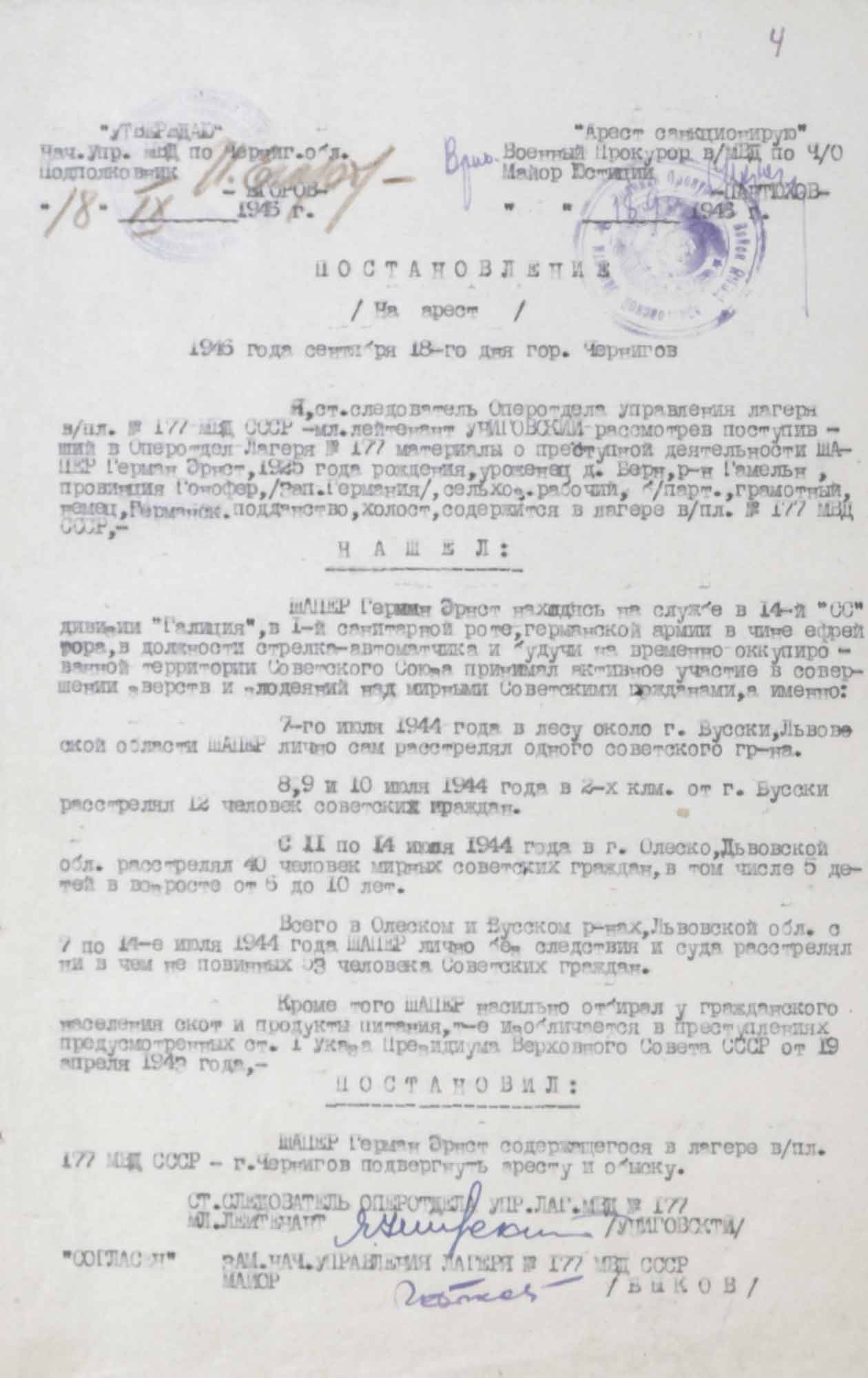 № 4. Постановление на арест Шапера Г.Э., бывшего ефрейтора 1 санитарной роты 14 дивизии СС "Галиция". 18 сентября 1946 г.