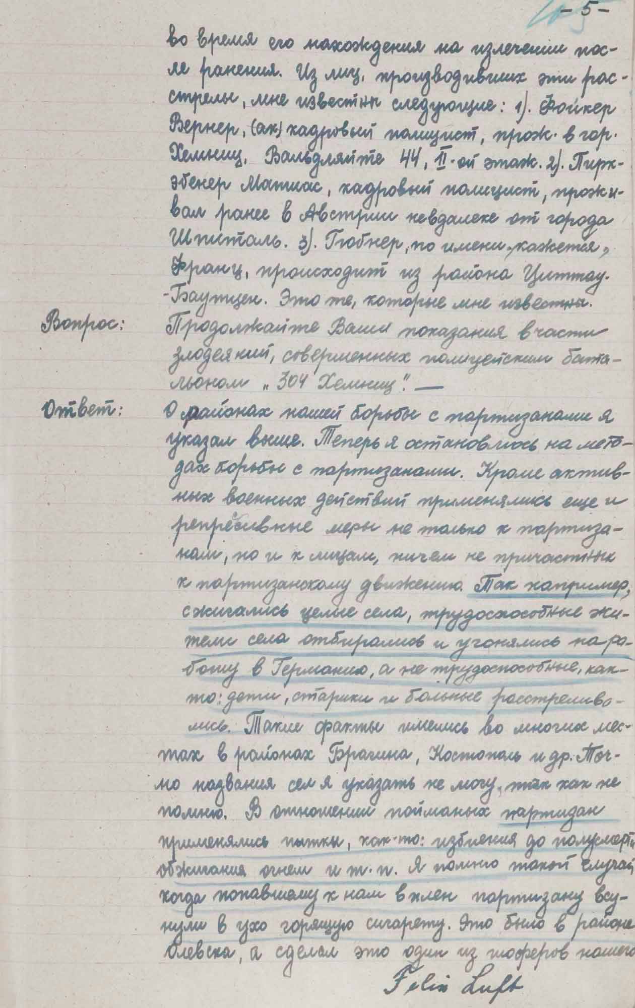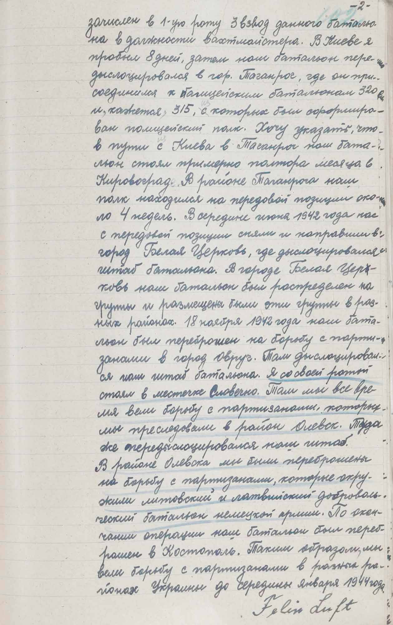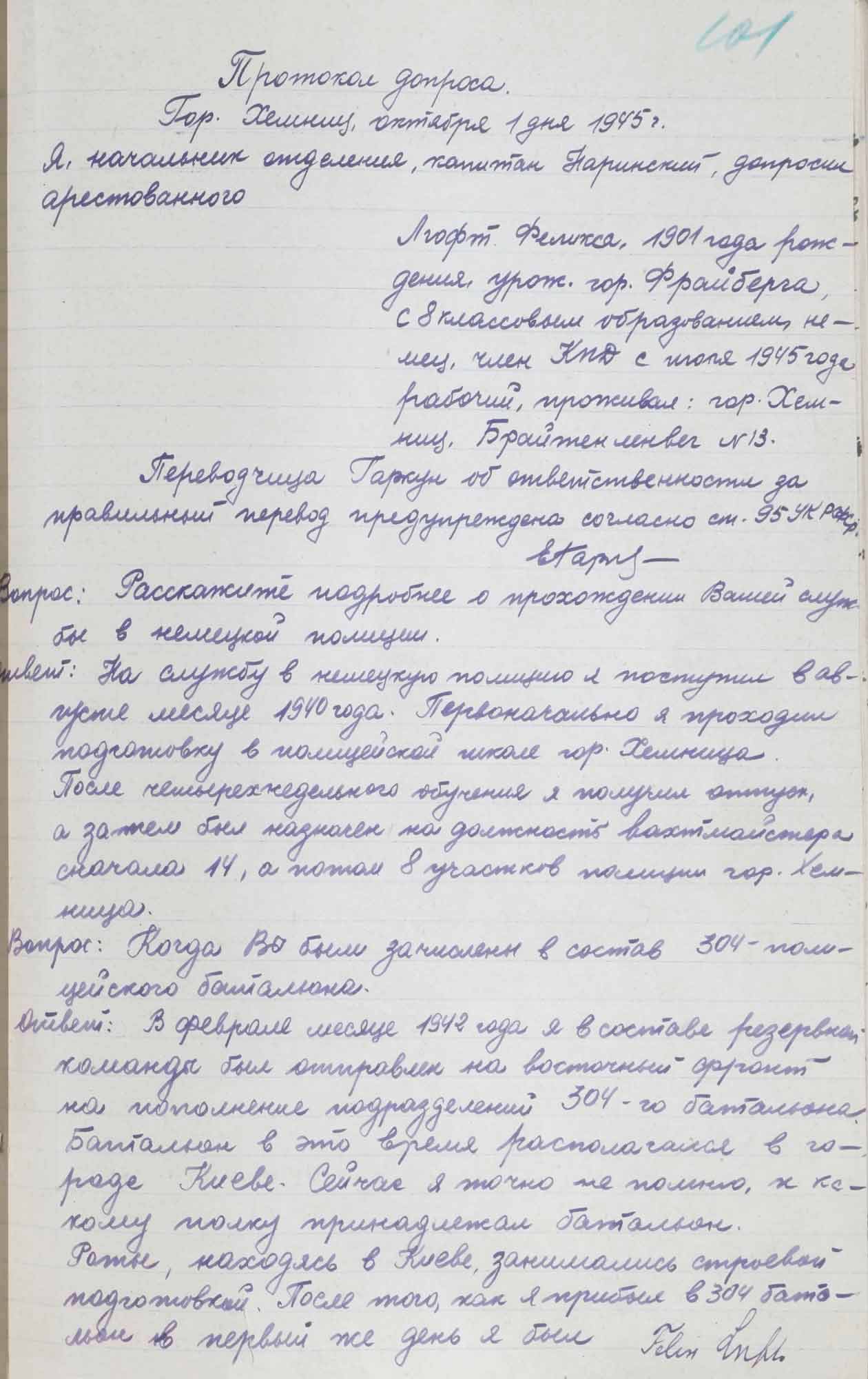 № 2. Протокол допроса Люфта Ф., бывшего полицейского 304 немецкого полицейского батальона. 1 октября 1945 г.