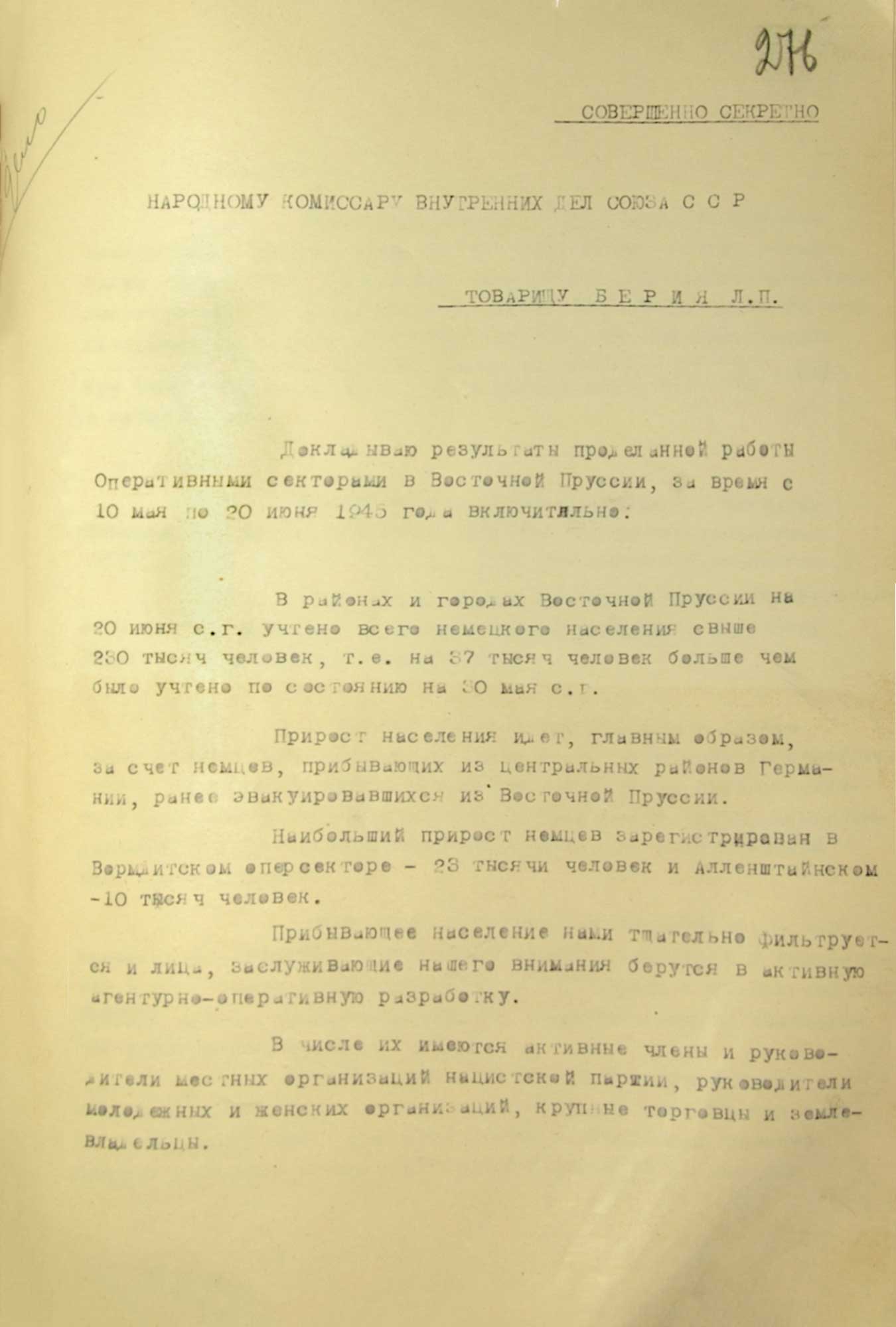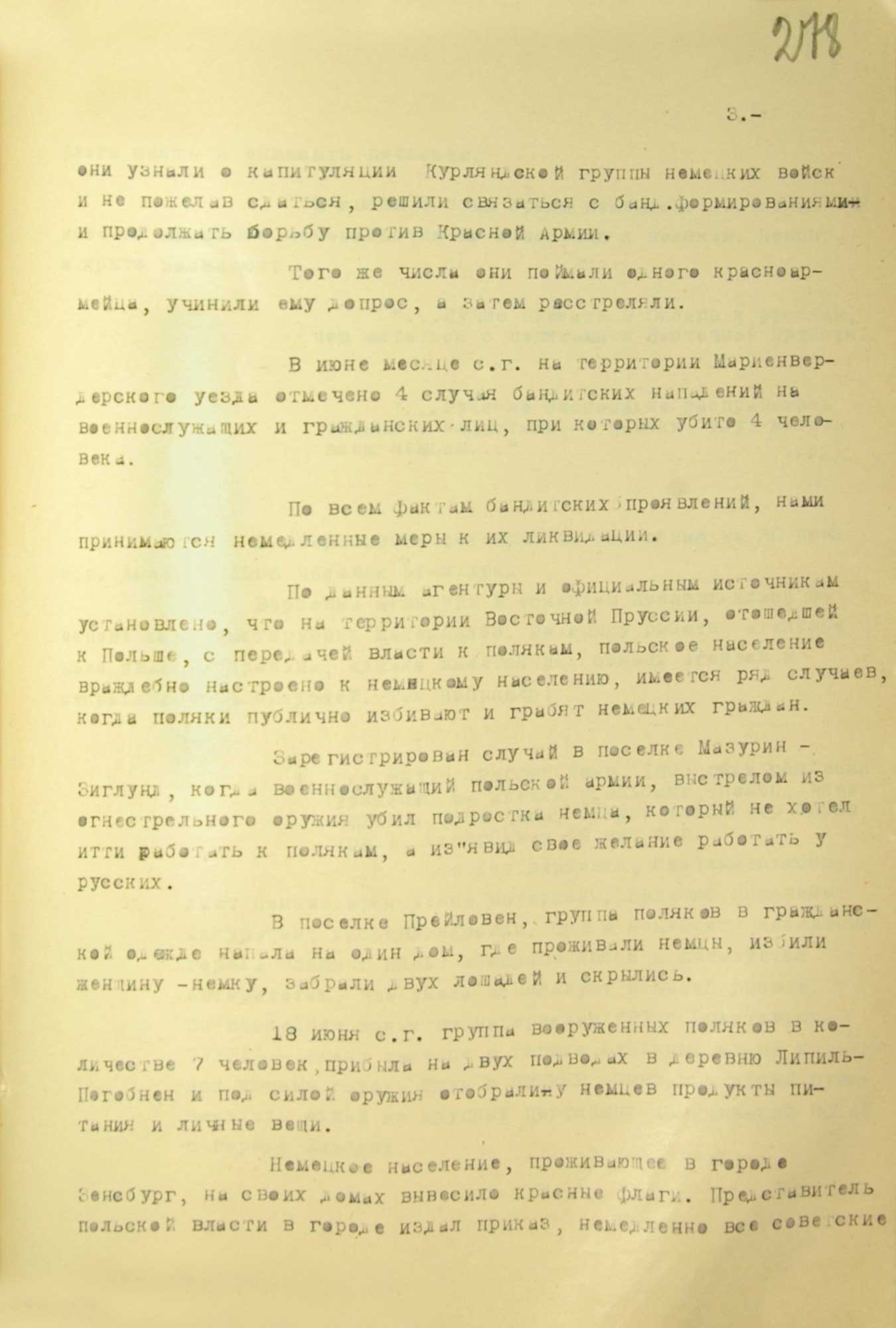 «[...] По данным агентуры и официальных источников установлено, что на территории Восточной Пруссии, отошедшей к Польше, с передачей власти к полякам, польское население враждебно настроено к немецкому населению, имеется ряд случаев, когда поляки публично избивают и грабят немецких граждан.