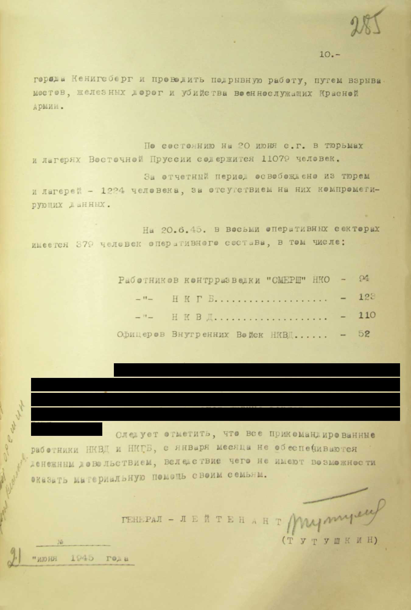 21 июня 1945 года Уполномоченный НКВД СССР по Восточной Пруссии генерал-лейтенант Ф. Тутушкин направил наркому внутренних дел Союза СССР Маршалу Советского Союза Л. Берии докладную записку о результатах работы, проделанной оперативными секторами с 10 мая по 20 июня 1945 года.