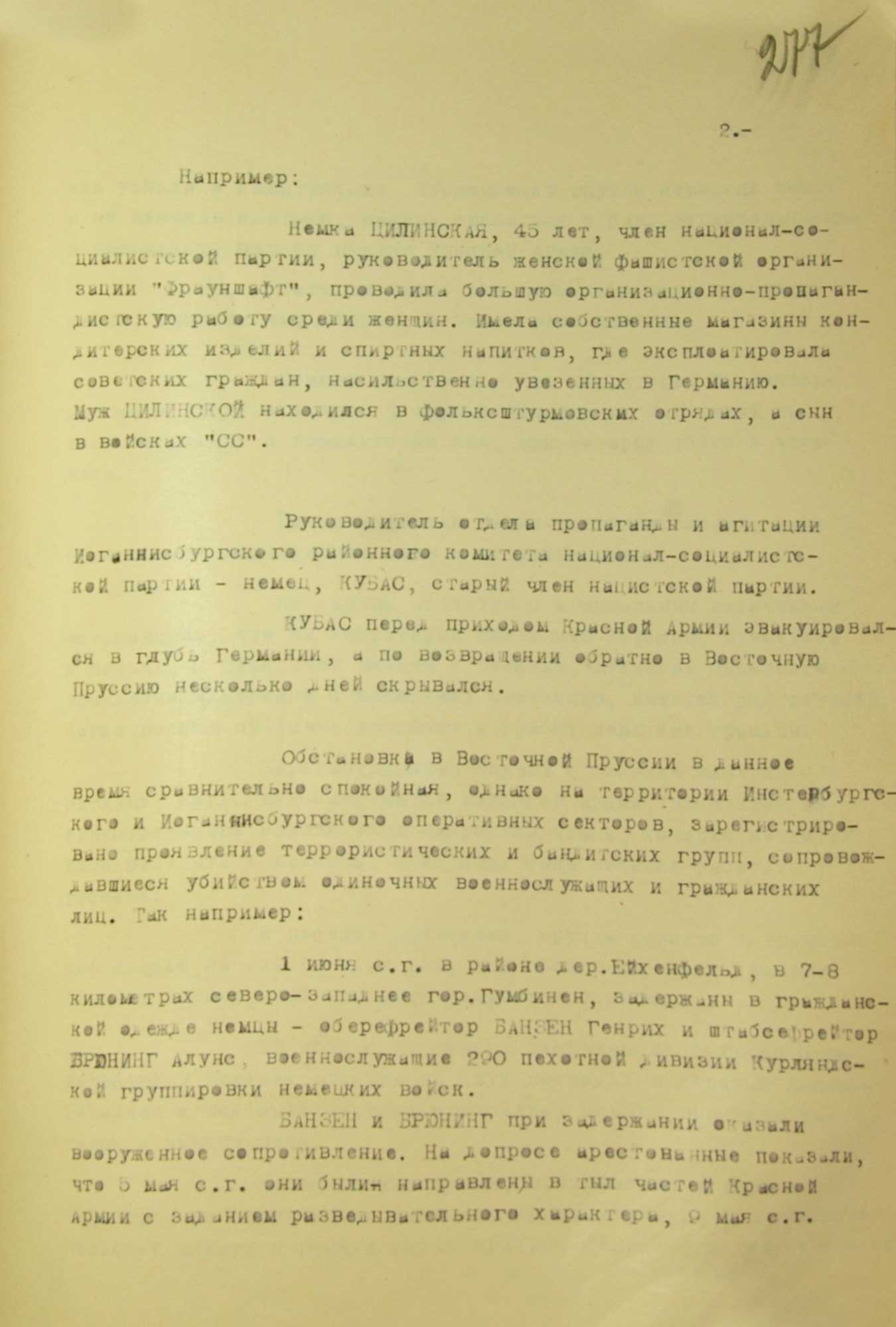 «Обстановка в Восточной Пруссии в данное время сравнительно спокойная, однако на территории Инстербургского и Иоганнисбургского оперативных секторов зарегистрировано проявление террористических и бандитских групп, сопровождавшиеся убийством одиночных военнослужащих и гражданских лиц...».