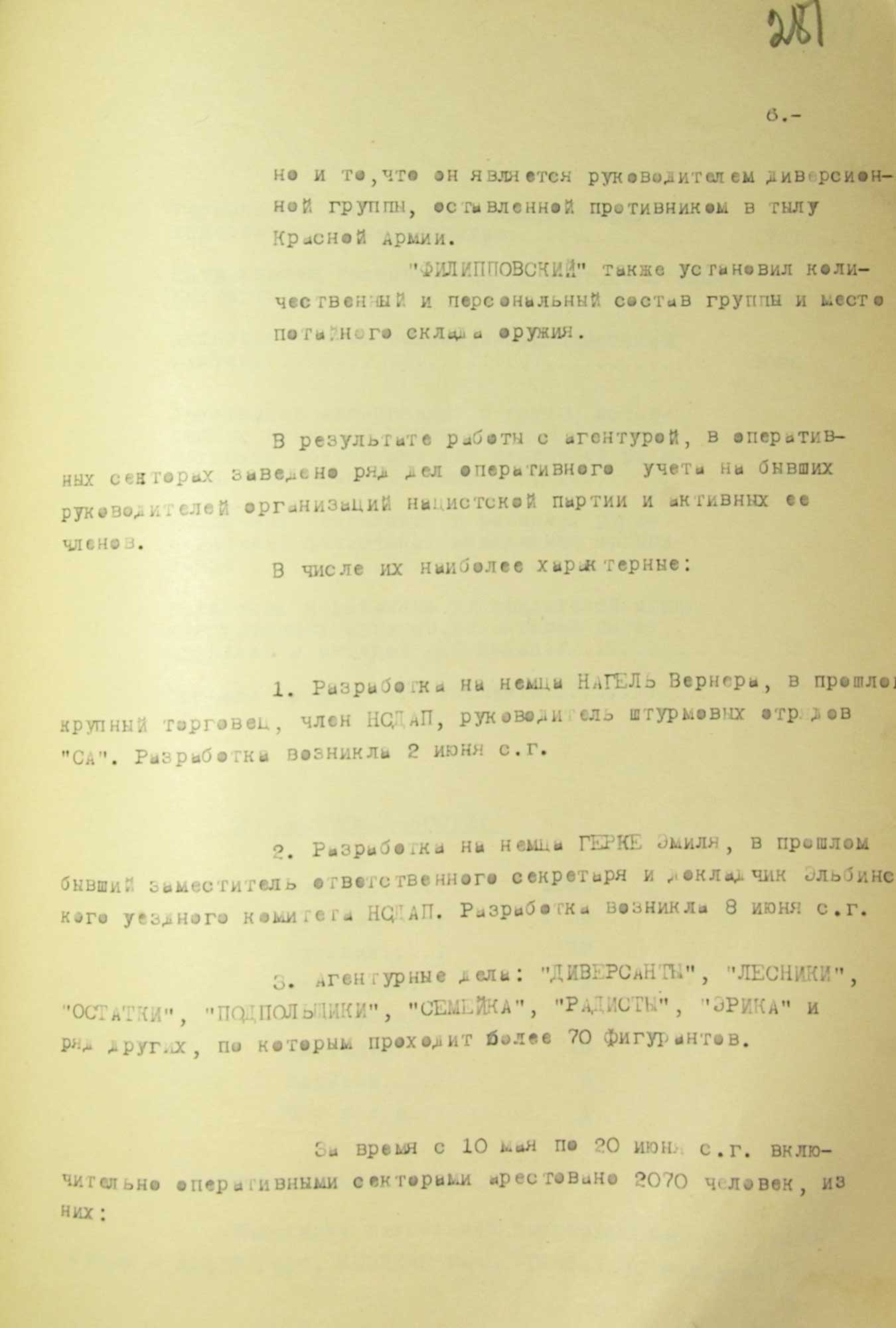 Докладная записка Уполномоченного НКВД СССР по Восточной Пруссии в НКВД СССР о результатах проделанной работы оперативными секторами с 10 мая по 20 июня 1945 года. 21 июня 1945 г. Кёнигсберг