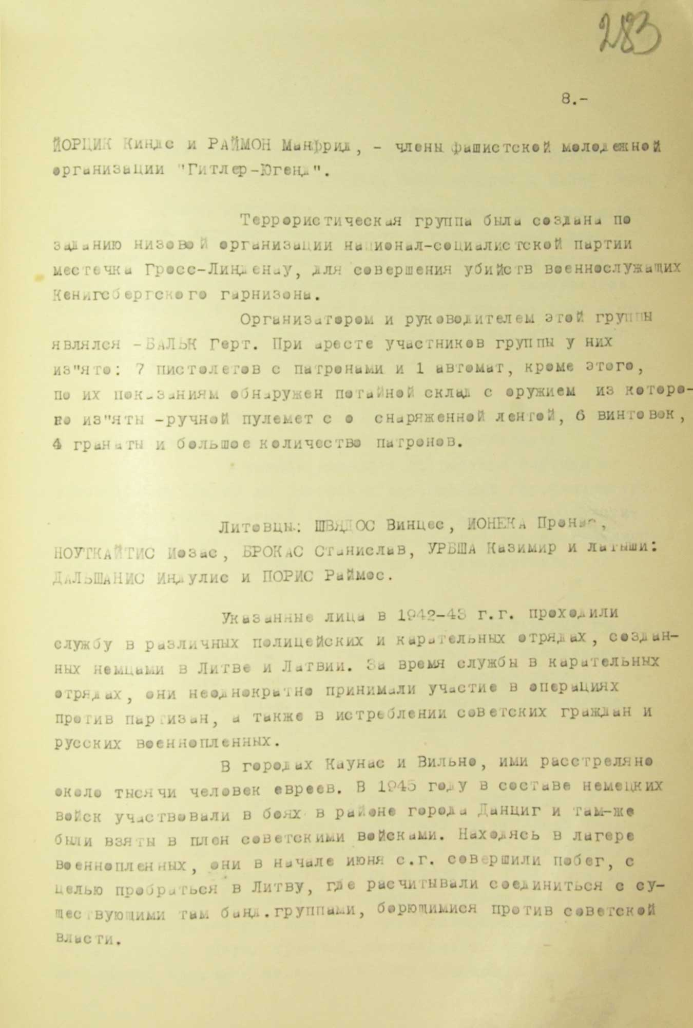 В городах Каунас и Вильно ими расстреляны около тысячи человек евреев. В 1945 году в составе немецких войск участвовали в боях в районе города Данциг и также были взяты в плен советскими войсками. Находясь в лагере военнопленных, они в начале июня с.г. совершили побег с целью пробраться в Литву, где рассчитывали соединиться с существующими там бандгруппами, борющимися против советской власти [...]».
