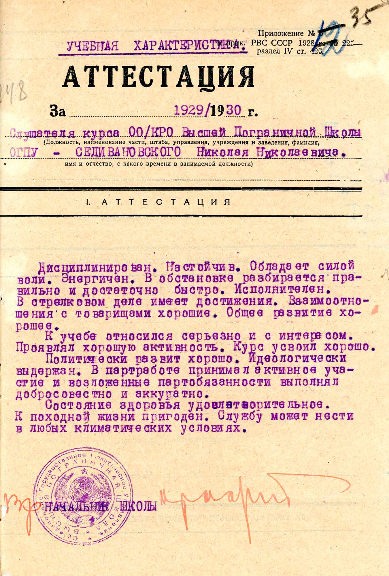Учебная характеристика слушателя курсов ОО/КРО Высшей пограничной школы ОГПУ Н.Н. Селивановского за 1929-1930 гг.
