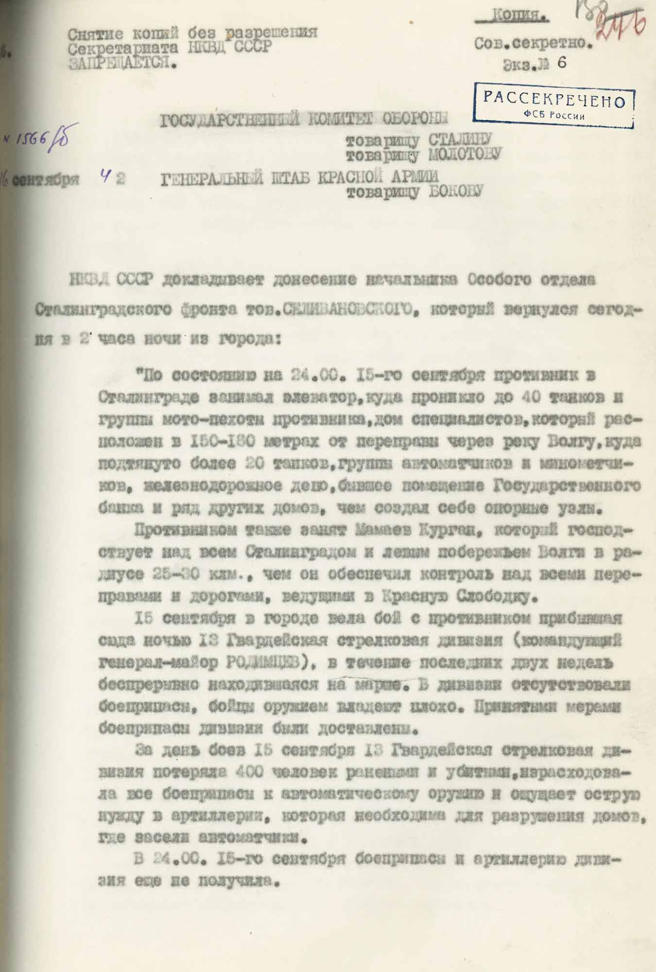 № 7. Докладная записка № 1566/б наркома внутренних дел СССР Л.П. Берии в ГКО (И.В. Сталину, В.М. Молотову) и Генштаб Красной Армии (генерал-майору Бокову Ф.Е.) «О положении в Сталинграде». 16 сентября 1942 года.