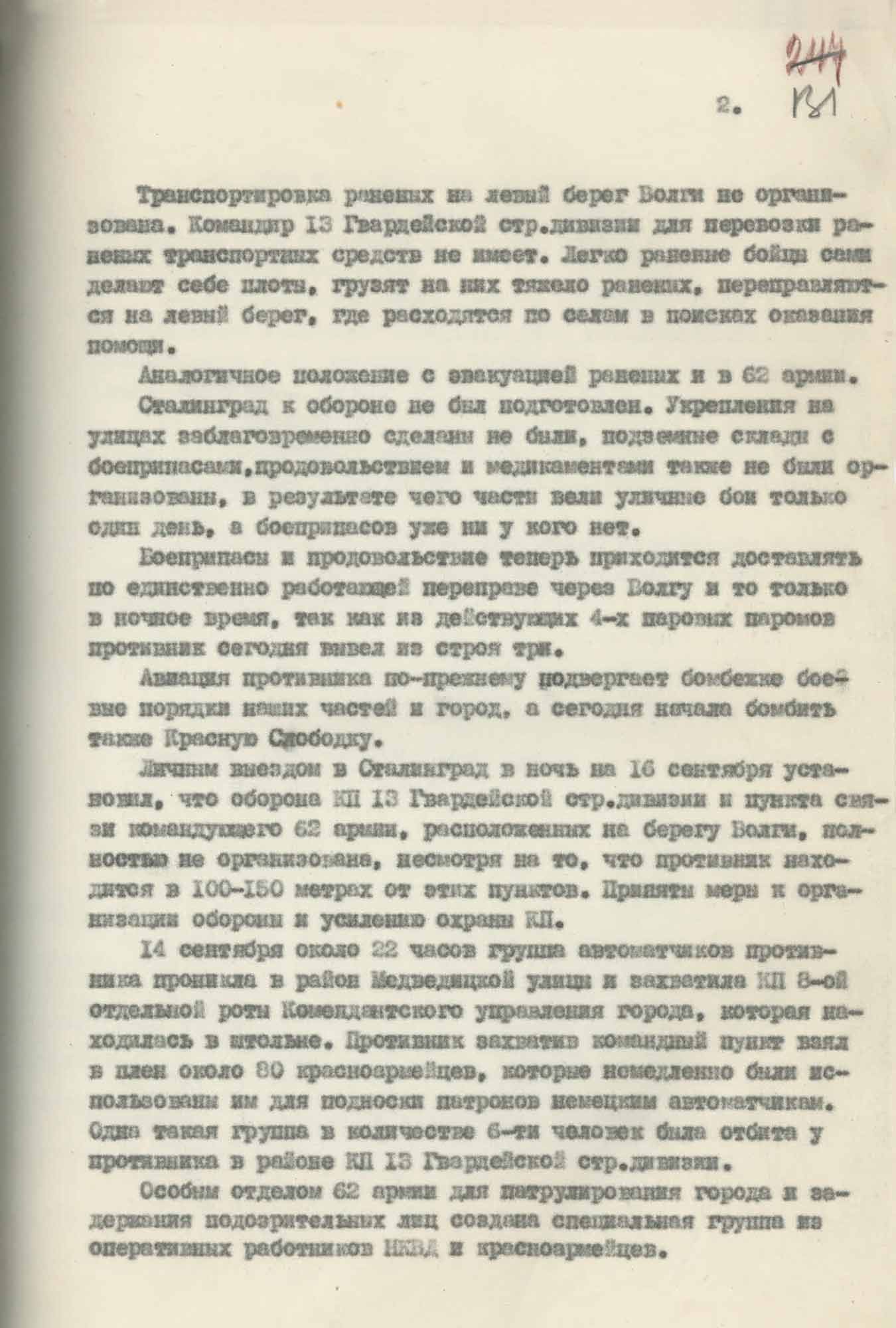 [...] Сталинград к обороне не был подготовлен. Укрепления на улицах заблаговременно сделаны не были, подземные склады с боеприпасами, продовольствием и медикаментами также не были организованы, в результате чего части вели уличные бои только один день, а боеприпасов уже ни у кого нет. Боеприпасы и продовольствие теперь приходится доставлять по единственно работающей переправе через Волгу и то только в ночное время, так как из действующих 4-х паровых паромов противник сегодня вывел из строя три [...]