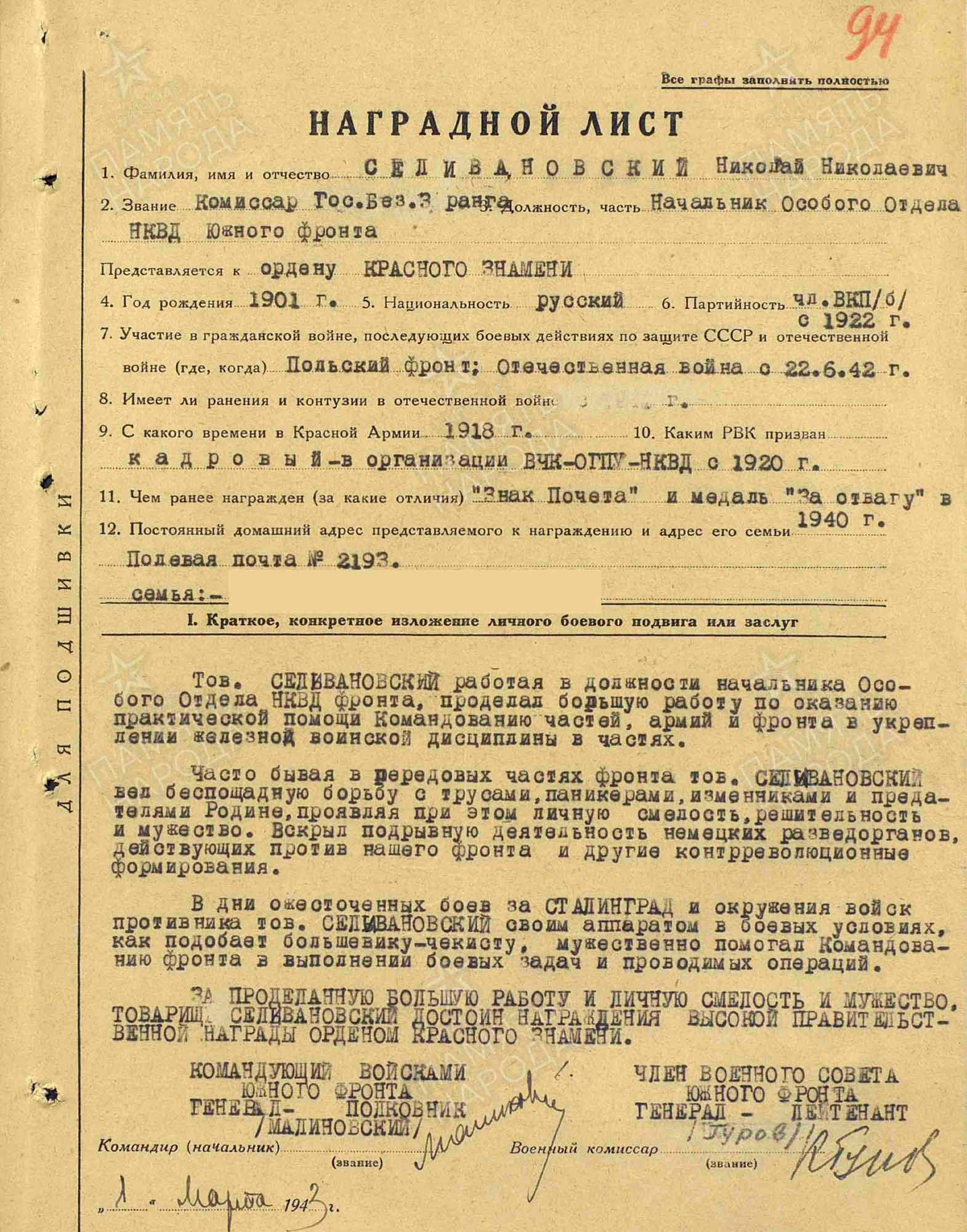 Представление к награждению орденом Красного Знамени комиссара госбезопасности 3-го ранга Селивановского Н.Н. от 1 марта 1943 г.