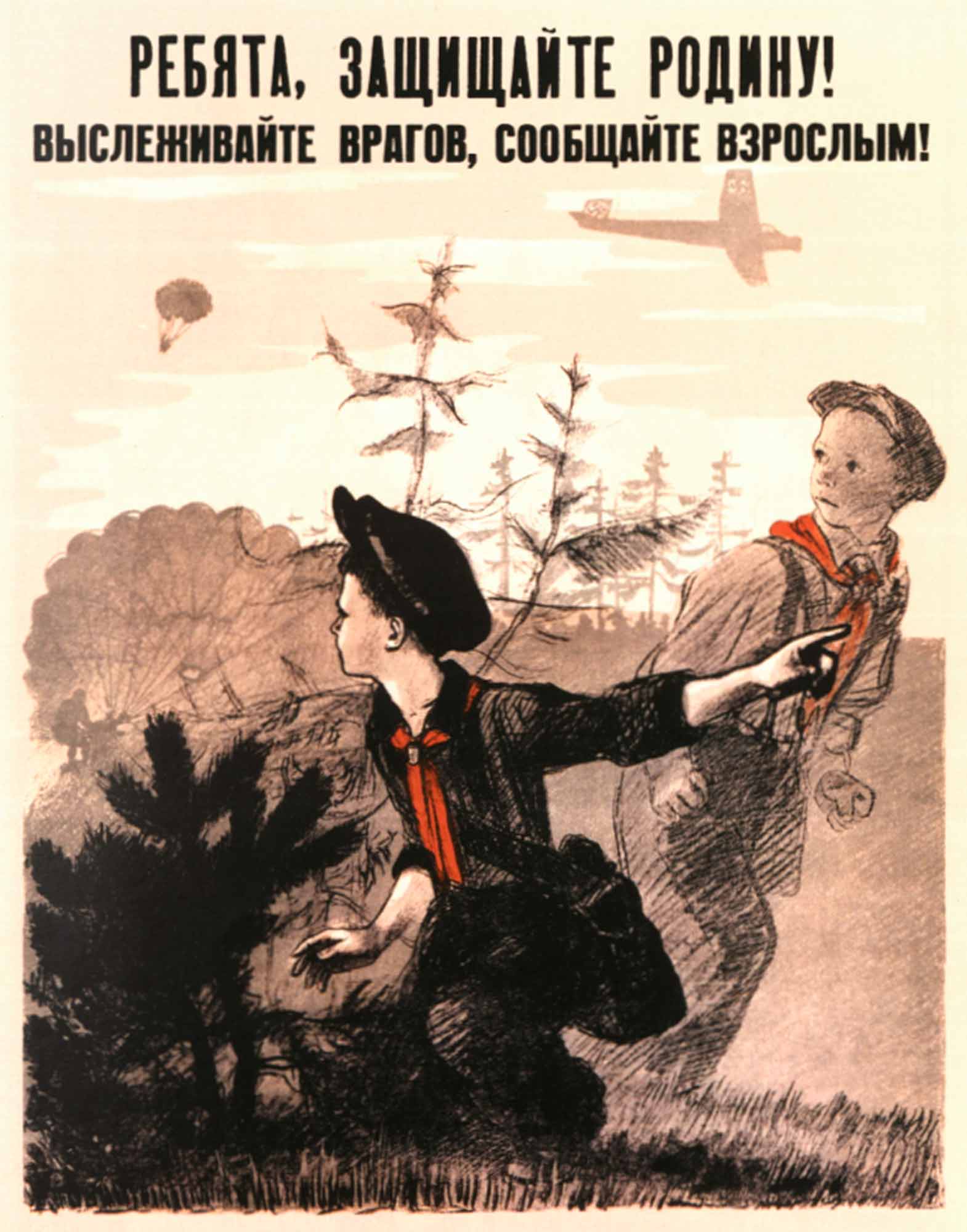 Плакат «Ребята, защищайте Родину! Выслеживайте врагов, сообщайте взрослым!», художник А. Пахомов, 1941 год.