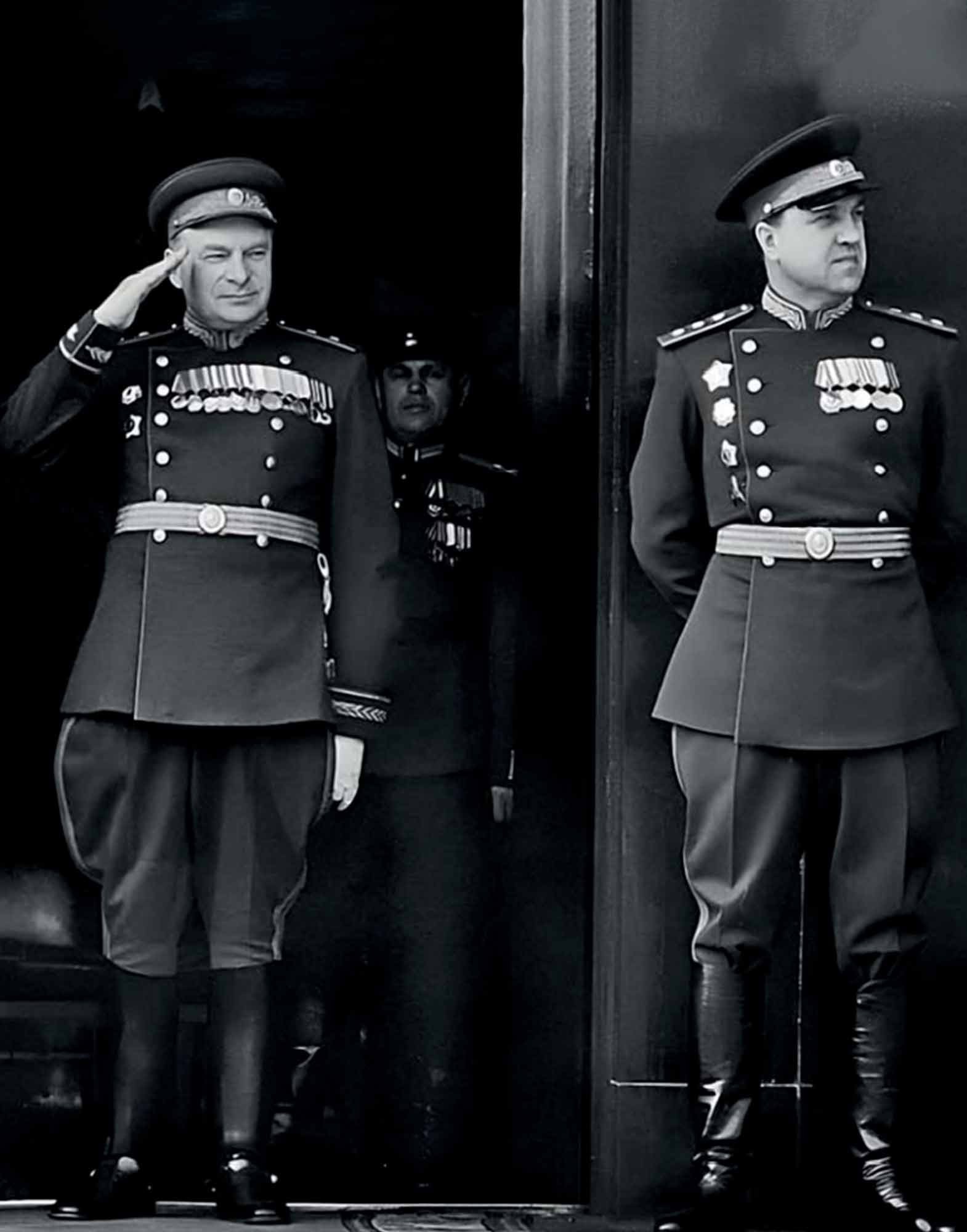 № 13. Министр госбезопасности СССР генерал-полковник Абакумов В.С. (справа) и его заместитель – генерал-лейтенант Селивановский Н.Н. у входа в Мавзолей В.И. Ленина в период проведения парада на Красной Площади, приуроченного ко Дню смотра боевых сил трудящихся всех стран, г. Москва, 1 мая 1946 года.